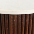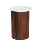 The dark and light combination of white marble and mahogany-hued wood gives the Meri Pedestal Table an heirloom appearance. The Meri Pedestal Table stands 20 inches tall and is 15 inches in diameter. The circular base is constructed of corrugated mahogany-hued wood that provides dimension and texture. Atop the sturdy base is a round, white marble slab that provides an easy-clean surface and longevity.