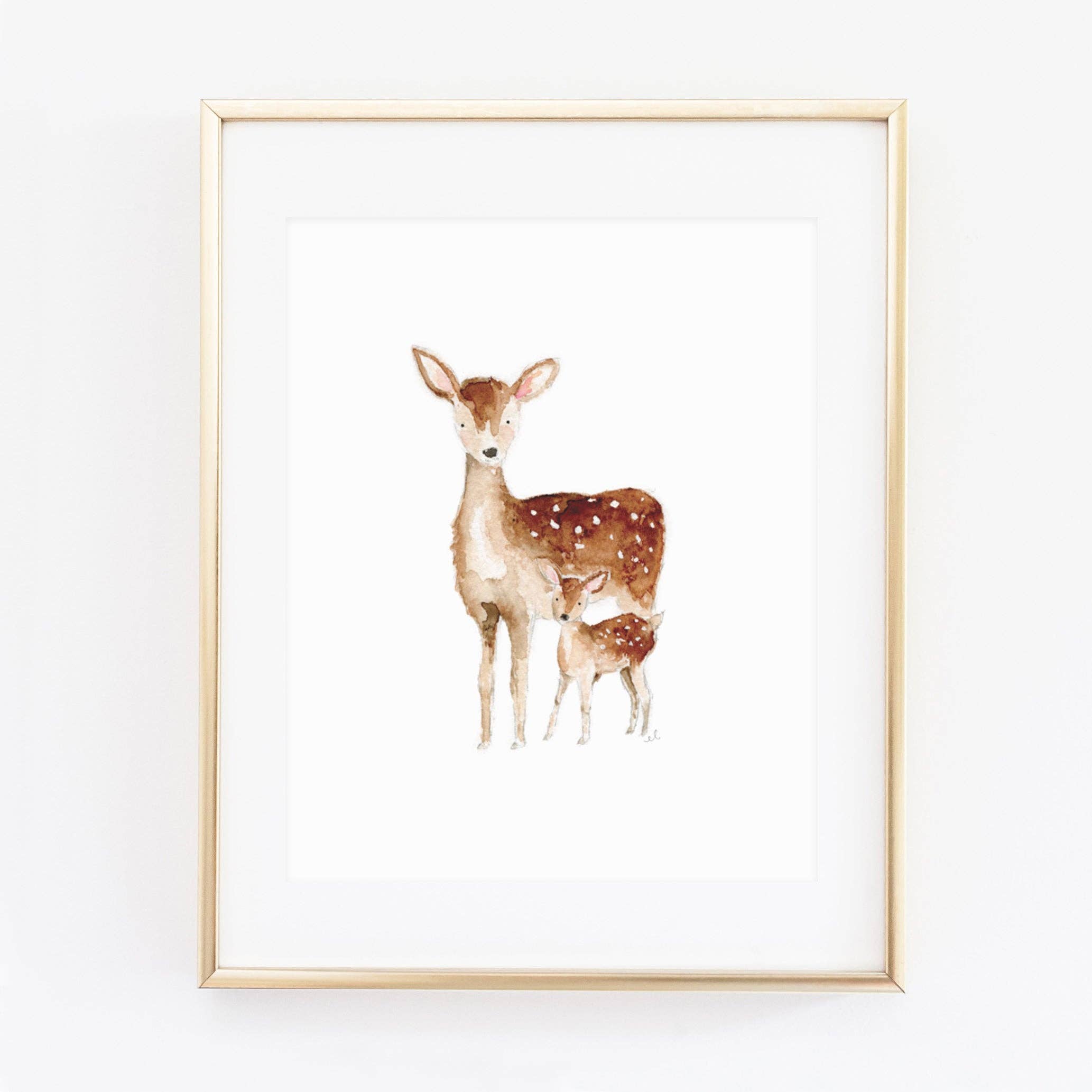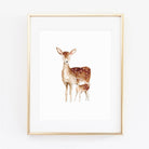 This mama + baby deer art print is sure to bring cheer to your home. Details: - 8"x10" print of original watercolor artwork by Emily Lex - Printed in full color on thick, superfine paper - Packaged in a clear protective sleeve with chipboard backing - Frame and mat not included