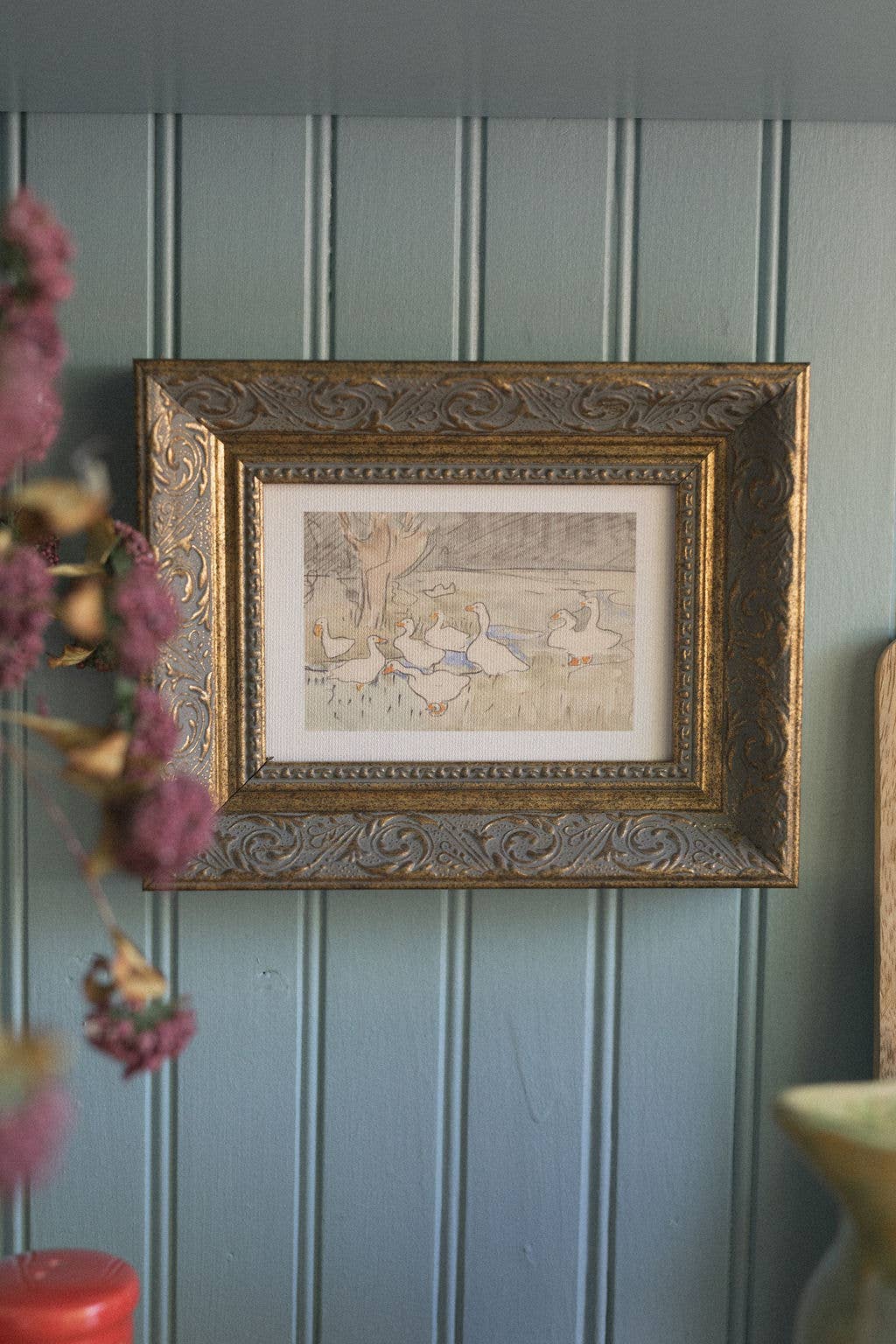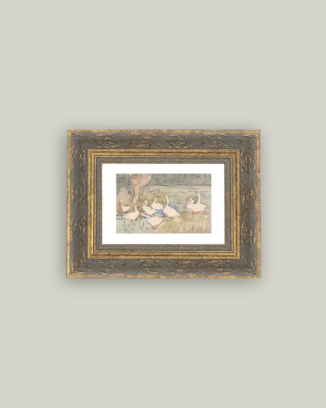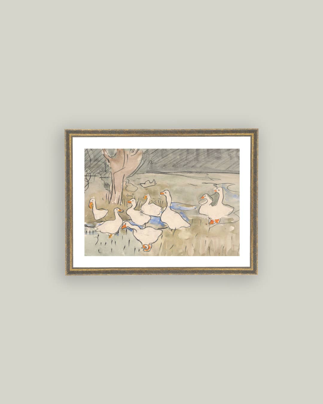 Geese Pond Framed Antique Art: 10x8