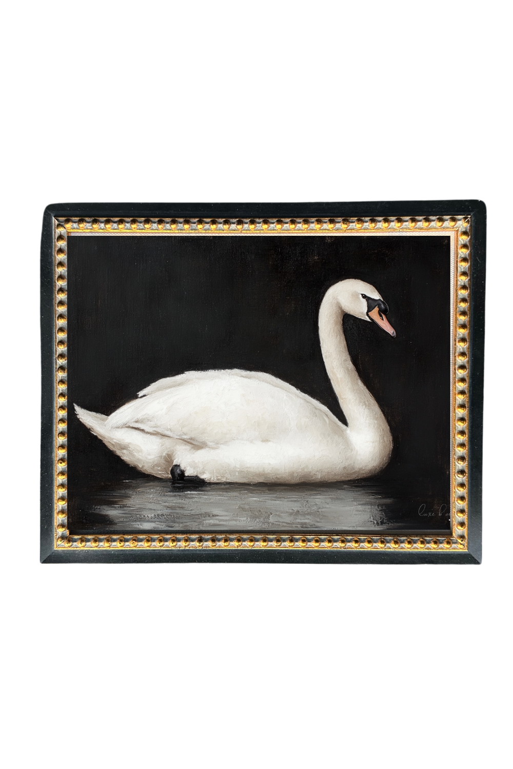 Moody Swan | Gold Beaded Black French Framed Art: 5 x 7