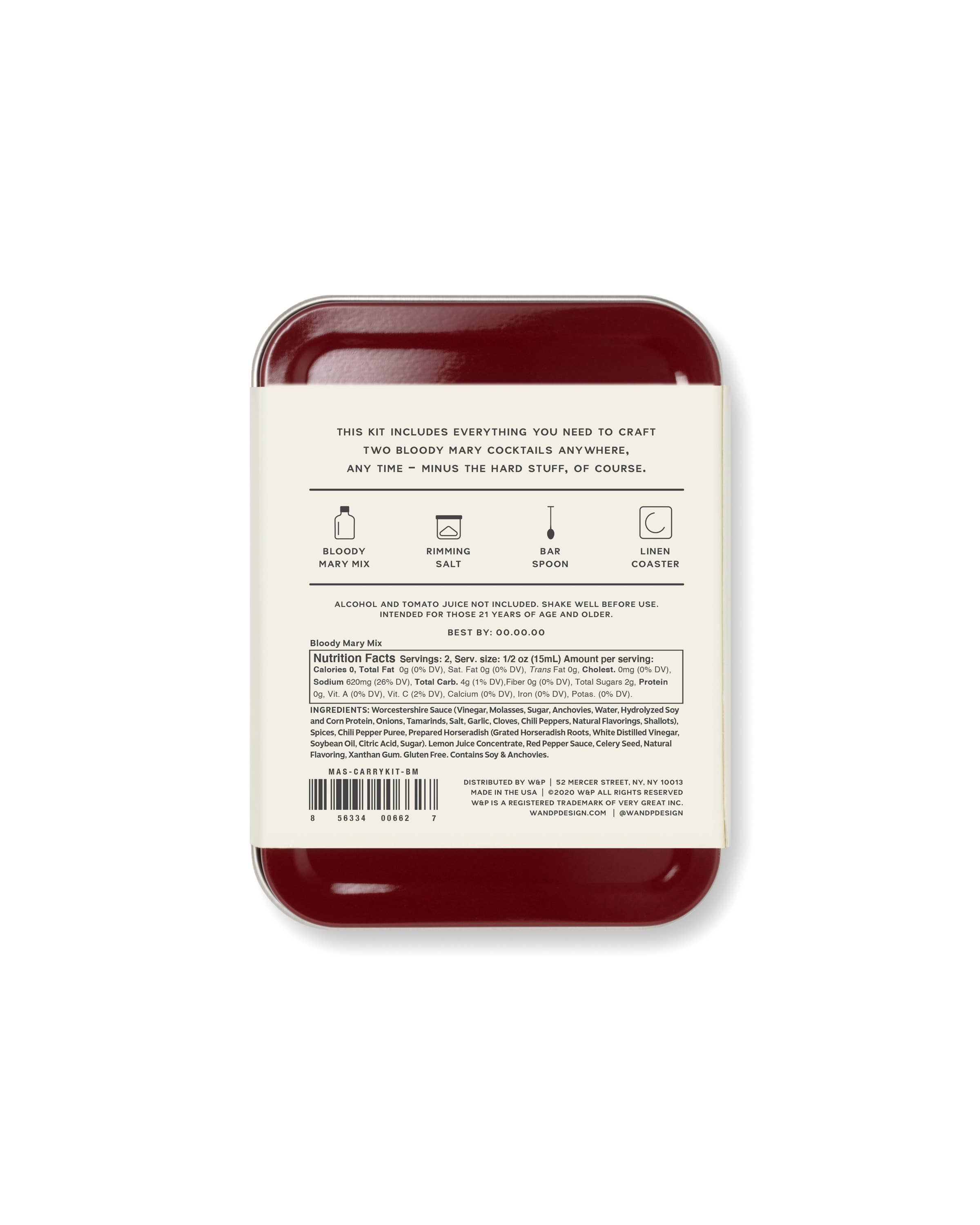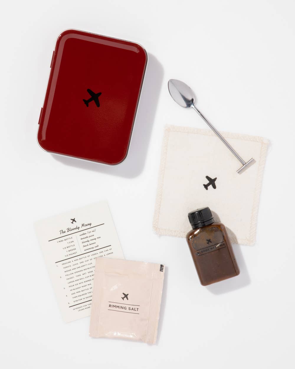 Perfect for Gifting - level up their barware with our small batch, USA Made Cocktail Syrups! This kit includes the tools to craft two Bloody Mary cocktails mid-flight: small-batch Bloody Mary mix, pack of rimming salt, a travel-size bar spoon, a recipe card and a linen coaster. Just add the hard stuff and stir. Bloody Mary kit includes: tin (dimensions 3.125" x 4.25" x 1"), recipe card, bar spoon, 1/2 oz jigger, Bloody Mary mix, rimming salt, linen coaster A perfect gift for coworkers, bachelor/bachelorette parties, holidays, or for anyone who appreciates the art of a great cocktail with top-notch, premium ingredients