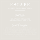 Indulge in the soothing and exotic blend of coconut and sandalwood with our enchanting Escape candle. The fragrance begins with the creamy and tropical essence of fresh coconut milk. As the scent unfolds, the aromatic and woody notes of sandalwood emerge, infusing a sense of tranquility. This candle is sure to fill your space with a calming ambiance that evokes images of sun-kissed shores and blissful relaxation.