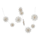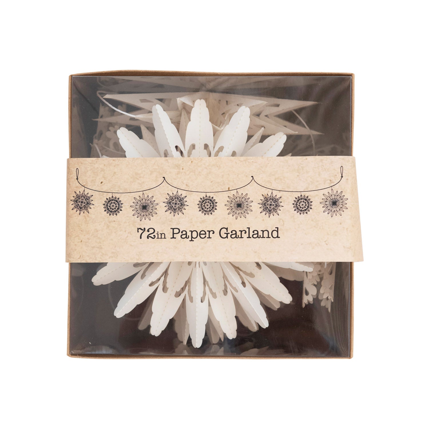 White snowflake garland in kraft box; Add to a seasonal display for a dash of whimsical holiday charm; Made from 95% Paper, 5% Cotton String. Add to a seasonal display for a dash of whimsical holiday charm.