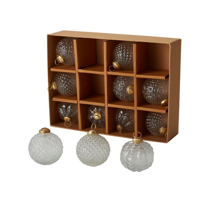 A beautiful collection, the Charise Ornaments are vintage inspired of clear glass Christmas ornaments. Three different patternsoptions, all with a gold metal tops and loops for attachment.