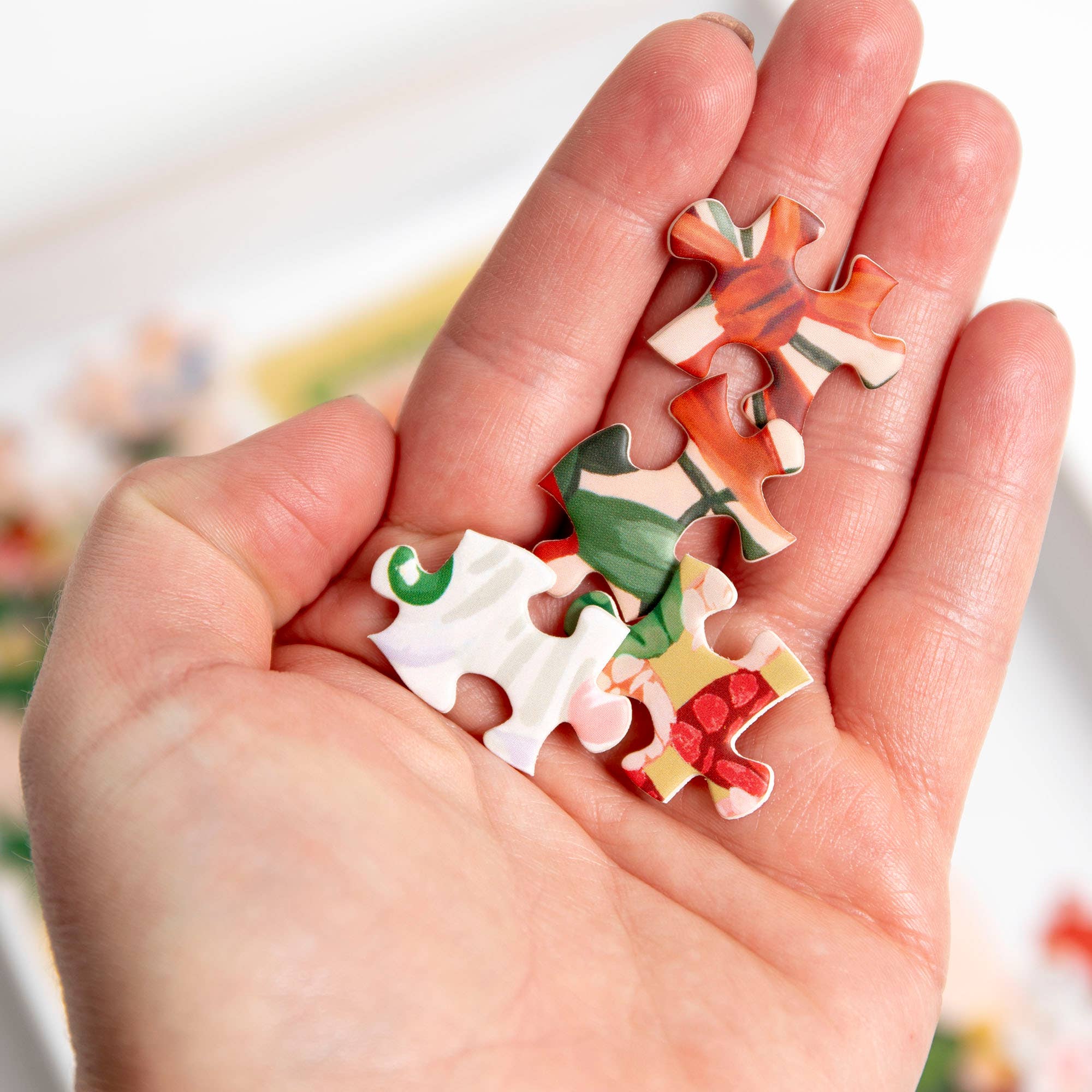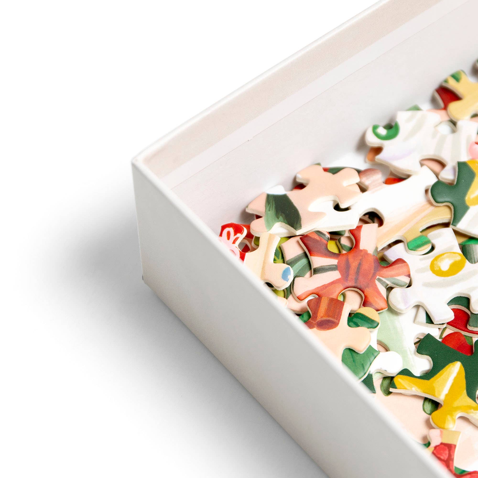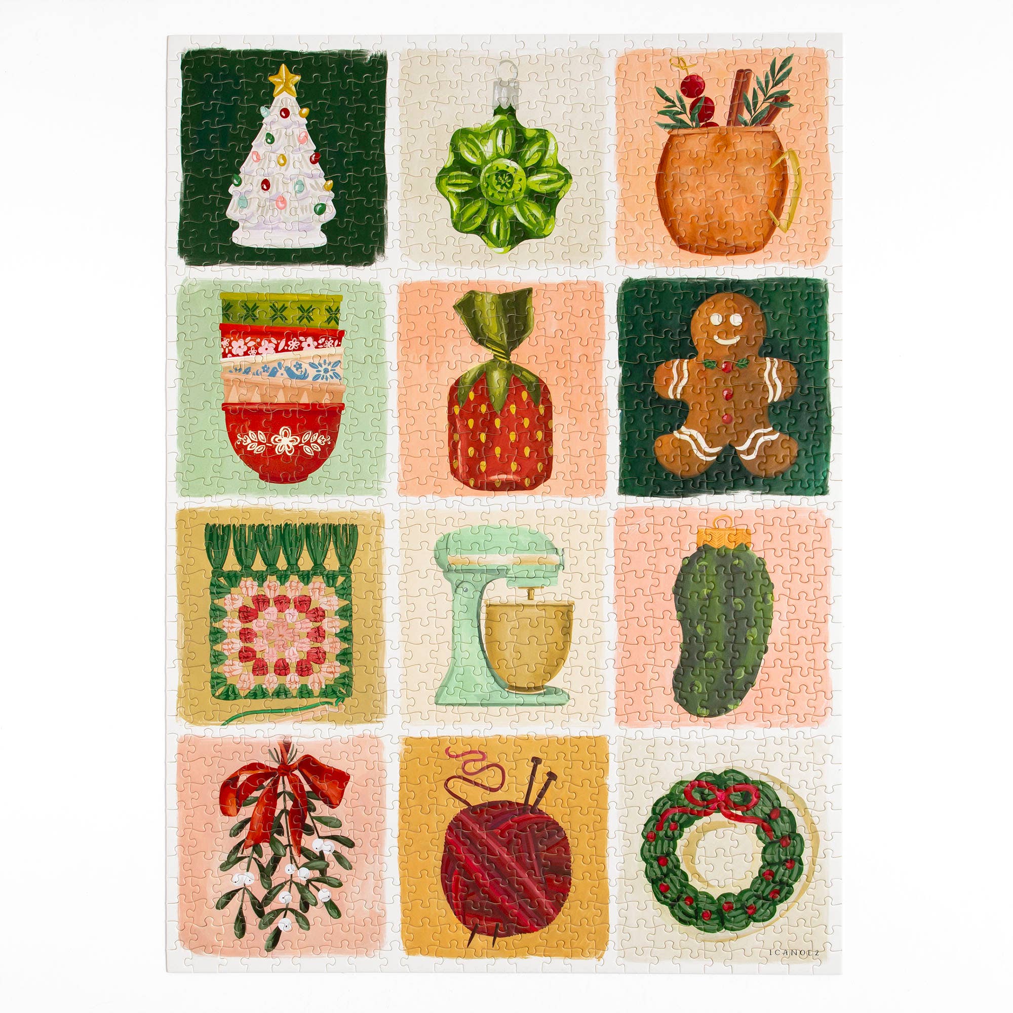 Take a trip down memory lane with our Christmas At Nana's House - 1,000 Piece Jigsaw Puzzle! This heartwarming puzzle features a grid-style design adorned with hand-painted icons reminiscent of holiday gatherings at Grandma's house. From vintage nestled mixing bowls to festive ornaments, a mixer to mistletoe, gingerbread cookies to knitting, each piece of this puzzle brings back the magic of Christmas past. With 1,000 pieces to assemble, this puzzle offers a fun challenge for puzzle enthusiasts and nostalgic souls alike. Gather your family and loved ones for a cozy evening of puzzling fun, or treat yourself to a relaxing activity and you piece together this tribute to the love and warmth found at Nana's house during Christmas. Format | 1000 pieces Features | Includes 9" x 12" art print Ages | 8+ Difficulty | Moderate Size | Complete puzzle: 26.77" x 19.29"; Box size: 8" x 10" x 2"