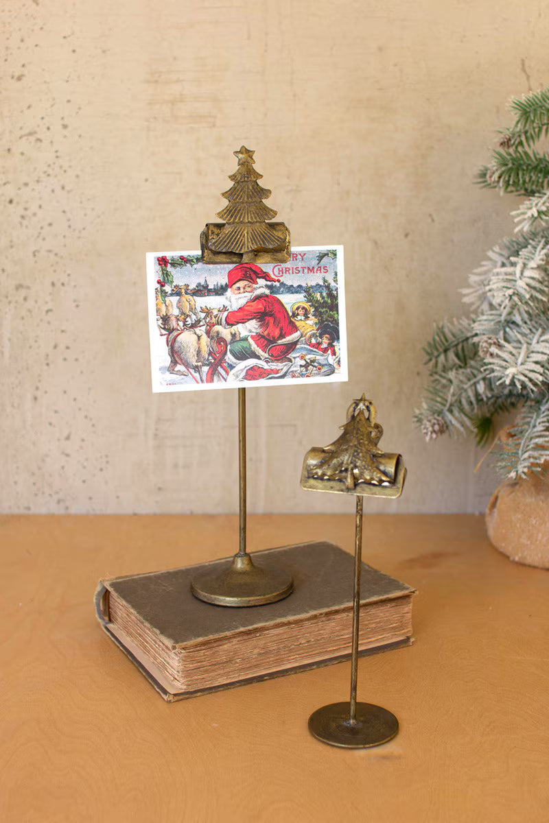Get ready for the holidays with these festive Christmas card clips. Display recipes for Santa's favorites, kids' artwork, or holly jolly mail on these two clips on stands. They are easily elevated and will last year after year.