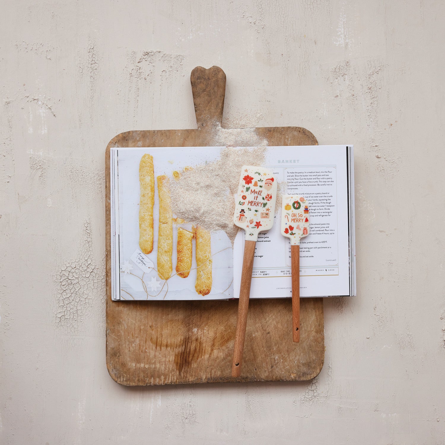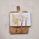 This set of two holiday-themed silicone and wood spatulas combines festive design with expert functionality. Each spatula features a durable silicone head adorned with seasonal patterns, paired with a sturdy wooden handle for comfortable grip and precise control. The included leather tie allows for convenient hanging and storage, adding a rustic touch to your kitchen décor. Perfect for mixing, scraping, and serving during holiday cooking and baking, these spatulas offer both practicality and seasonal charm, making them an ideal gift or a stylish addition to your festive culinary tools