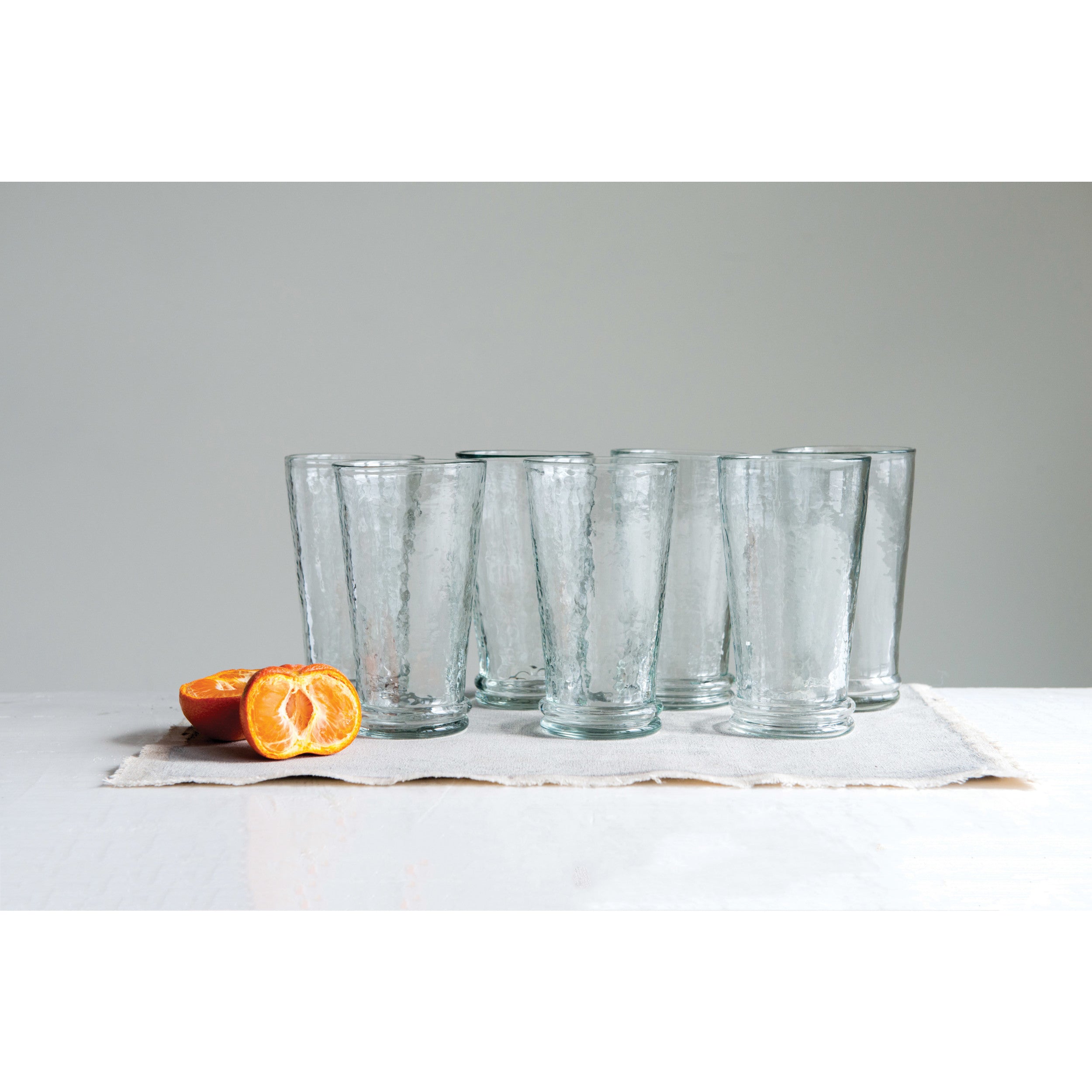 Crafted from recycled glass, these elegant drinking glasses bring sustainable style to any setting. Each piece is carefully handmade, ensuring unique character and quality. Their versatile design suits both casual gatherings and sophisticated dinners, making them a practical yet refined choice. Measuring 3-1/2" in diameter and 6" tall, with a 16 oz capacity, they are perfectly sized for a variety of beverages. Incorporate eco-friendly sophistication into your tableware collection with these durable, timeless glasses.