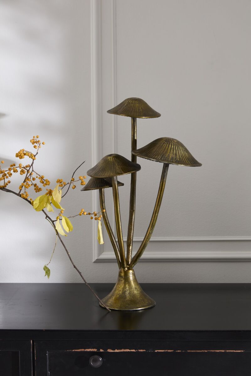 Create a charming seasonal display with the Maitake Forest Mushroom, featuring beautifully carved lines atop 4 slightly curved caps. These textured cast aluminum mushrooms have elongated stalks attached to a circular base & bring a rich, warm gold tone to any tablescape or mantle. Pair them with other mushrooms for a layered, autumn-inspired look.