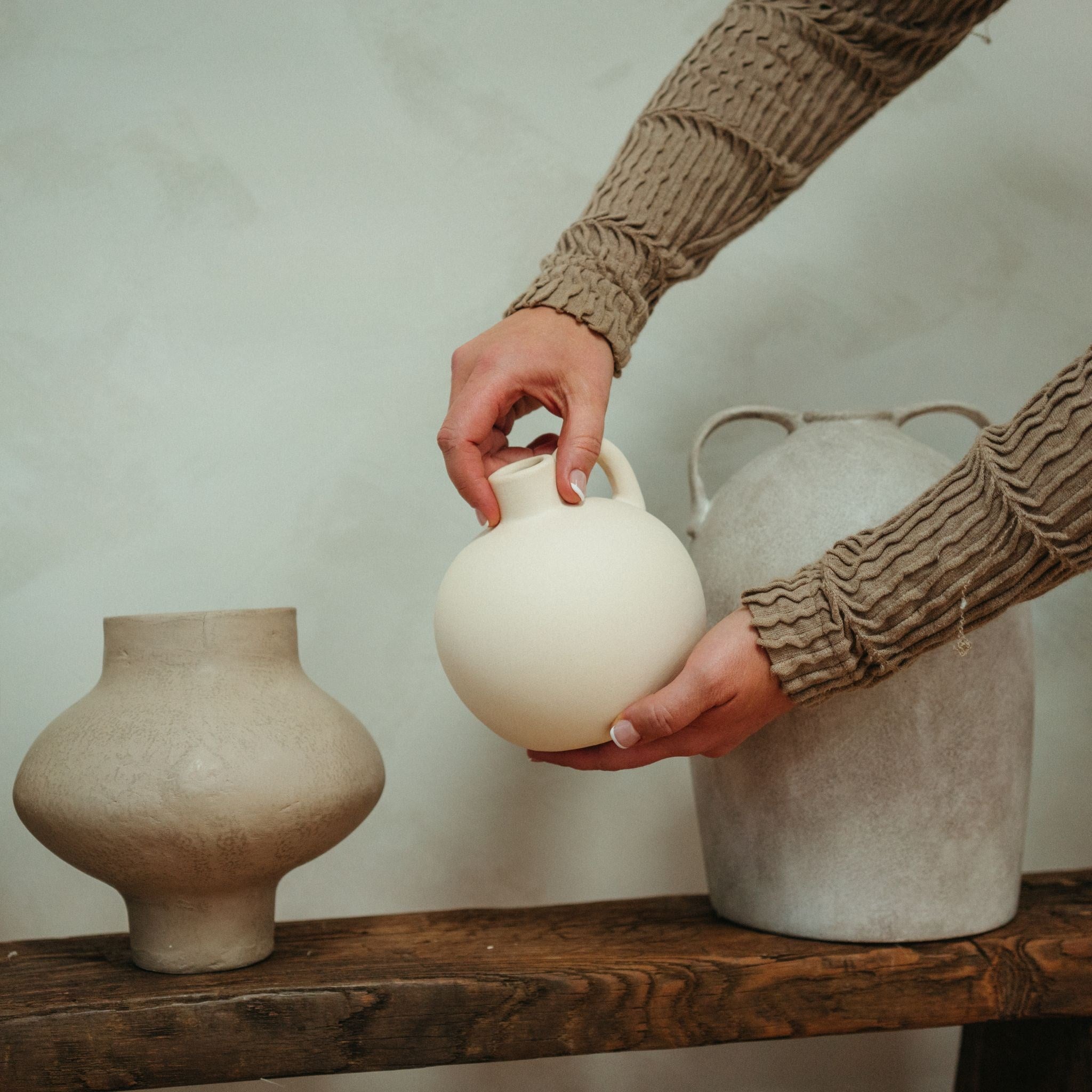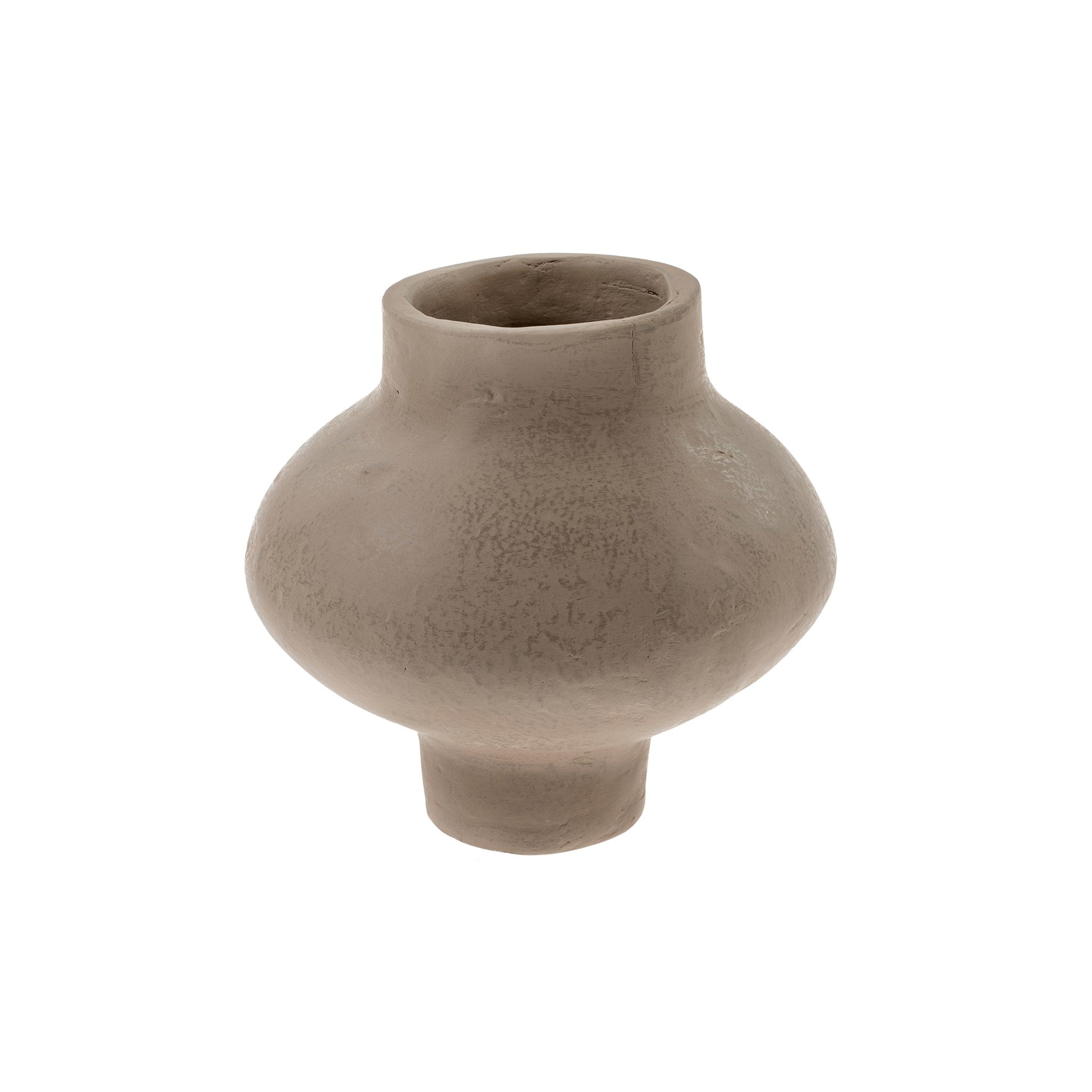 The Solace Paper Mache Vase is handcrafted from eco-friendly papier mache and has a chalky, limewash like texture. Its alluring rounded profile and versatile neutral coloring make it an effortless addition to side consoles and bookcases, infusing character and style. Made from recycled newspaper, they are entirely natural and sustainable. First the newspaper is mixed with water, then chalk and tree sap crystals are added to turn the substance into a clay-like material. The pulp is kneaded into chapati-like forms, then rolled and moulded into the sculptural objects we love. There is no firing, no power used, and the process is entirely eco-friendly. Each piece will have subtle differences in finish and these variations are part of the handmade appeal. Porous in nature, papier mache should not be exposed to liquids.