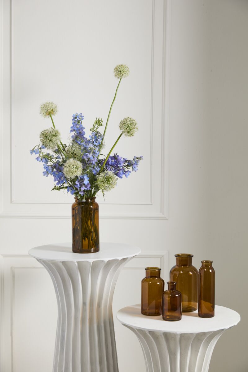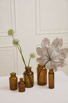 The Amber Billie Bottle Collection features five warm, translucent amber vases and budvases in varying sizes, ideal for creating a cohesive and elegant floral arrangement. With opening diameters ranging from under an inch to nearly three inches, these vases accommodate both fresh and dried stems, making them an excellent choice for autumnal decor and stylish table settings.