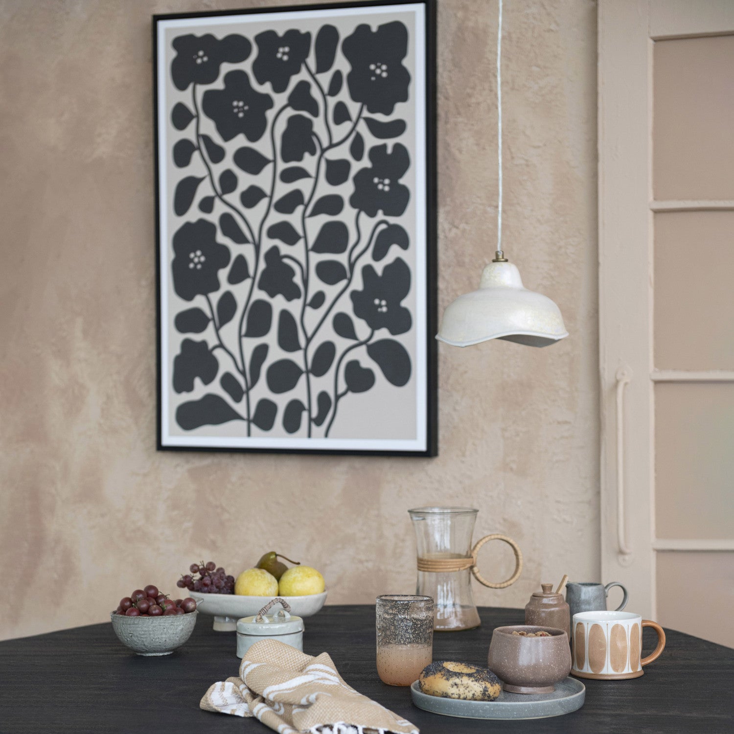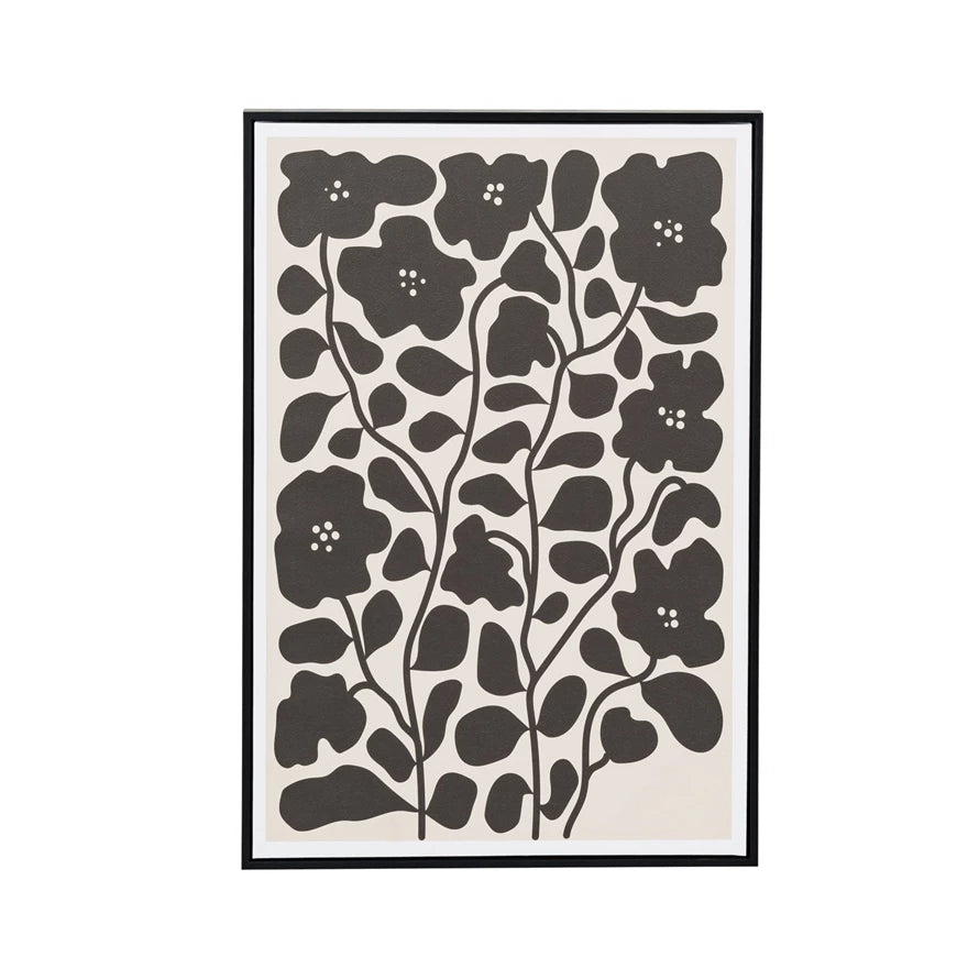 This reclaimed wood wall decor features a beautiful and elegant piece of art. The frame is made from salvaged wood from old buildings or furniture, and is repurposed into new items. The frame covers a glass that protects a paper print of flowers in a black and cream color. The print features a variety of flowers and is hung vertically on the wall. Place it in any room of the house, from the living room to the bedroom, and create a stylish and charming atmosphere. This decor is suitable for Scandinavian, boho, global, modern, or French country styles, adding sophistication to any space. The hanging mechanism on the back allows for vertical hanging, making it a versatile addition to any room. Each piece will vary slightly in color and shape due to the reclaimed wood and handmade process.