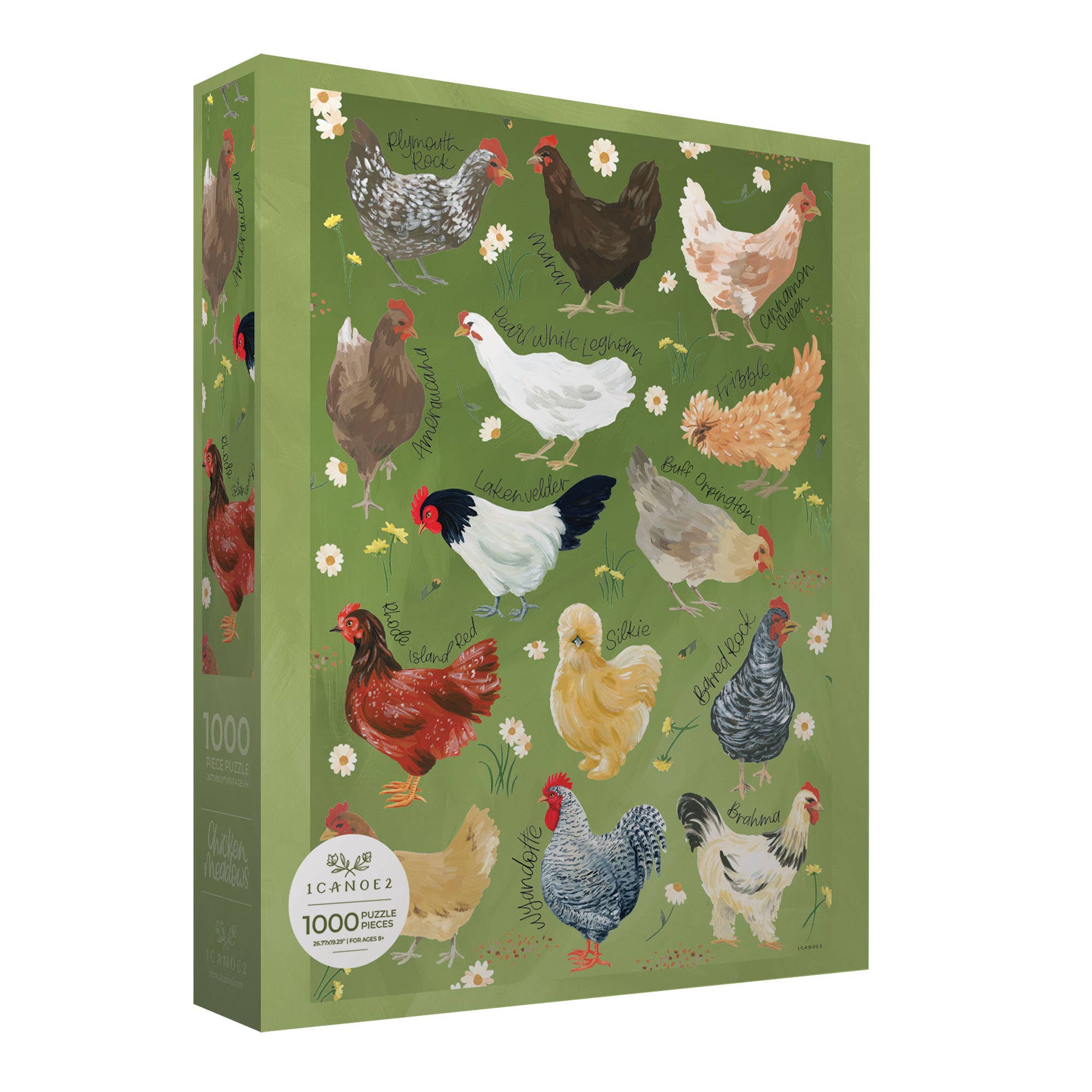 Bring the charm of the coop to life with our Chicken Meadows 1,000-Piece Jigsaw Puzzle. Featuring a vibrant farm scene, this puzzle showcases beloved chicken breeds like Plymouth Rock, Maran, Rhode Island Red, Silkie, and more. Each piece highlights the intricate details of these stunning chickens, offering a satisfying challenge for puzzle enthusiasts and bird lovers alike.