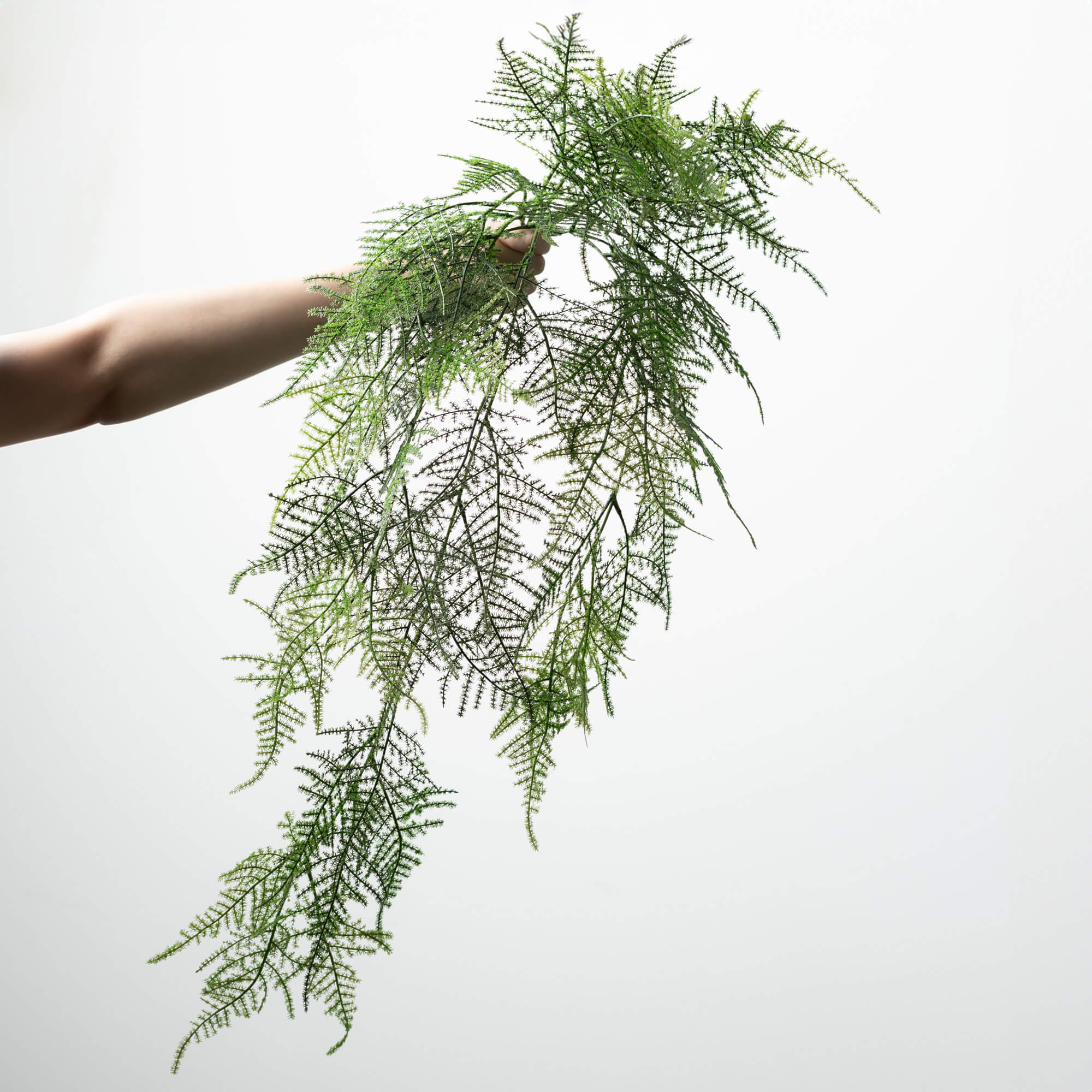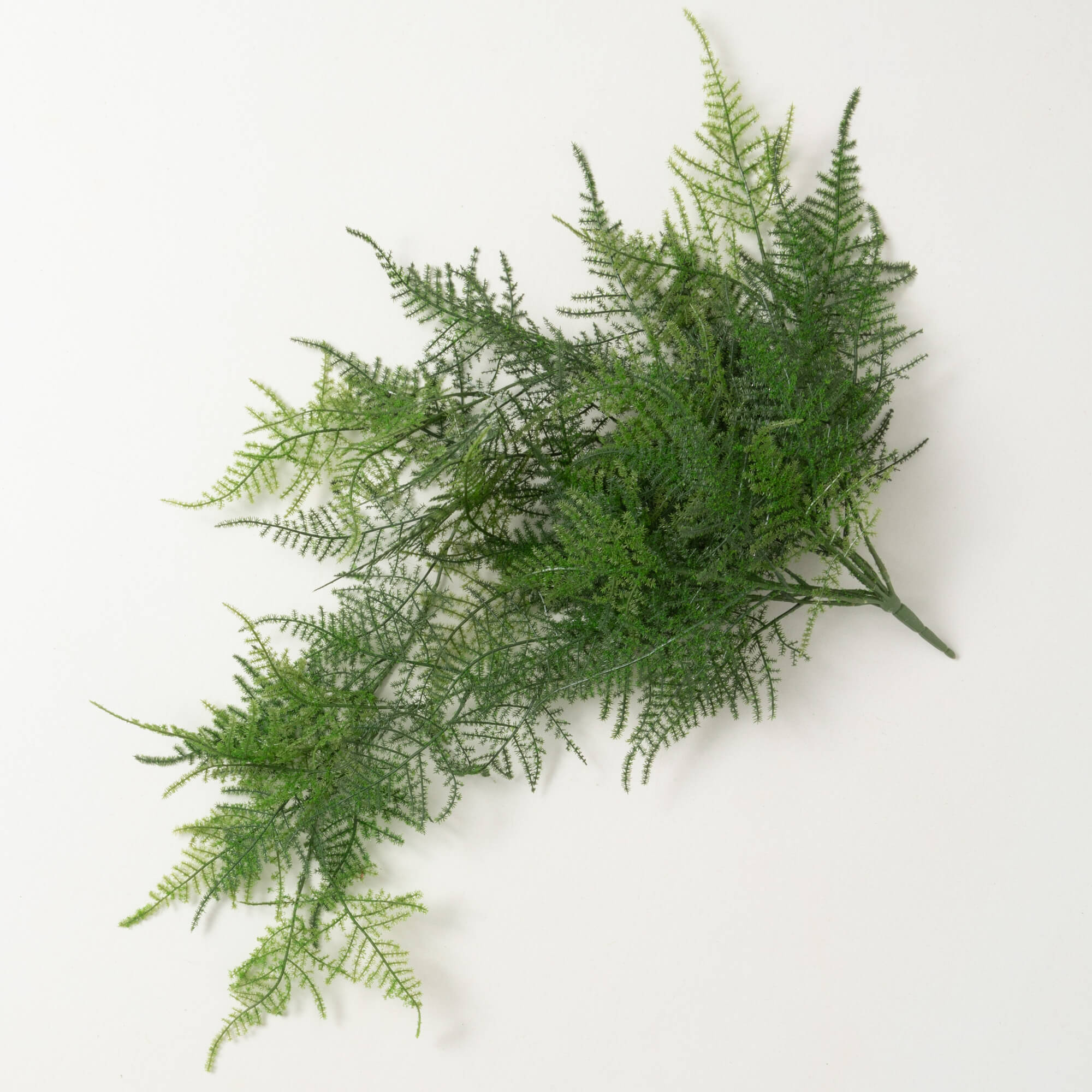 Bring the lush, verdant vibes of the tropics into your home with this Large Plumosa Fern Bush from Sullivans. This lifelike faux greenery looks as fresh as the real thing, with delicate, feathery fronds that sway with the slightest breeze. Crafted with meticulous attention to detail, this statement fern will instantly elevate any space, from a cozy corner to a bright entryway. Its natural beauty and low-maintenance nature make it the perfect way to add a touch of lush, leafy charm without the hassle of watering or pruning. Bring the outdoors in and let this plumosa fern bush breathe new life into your decor