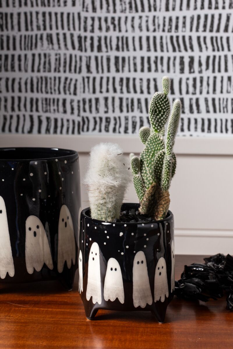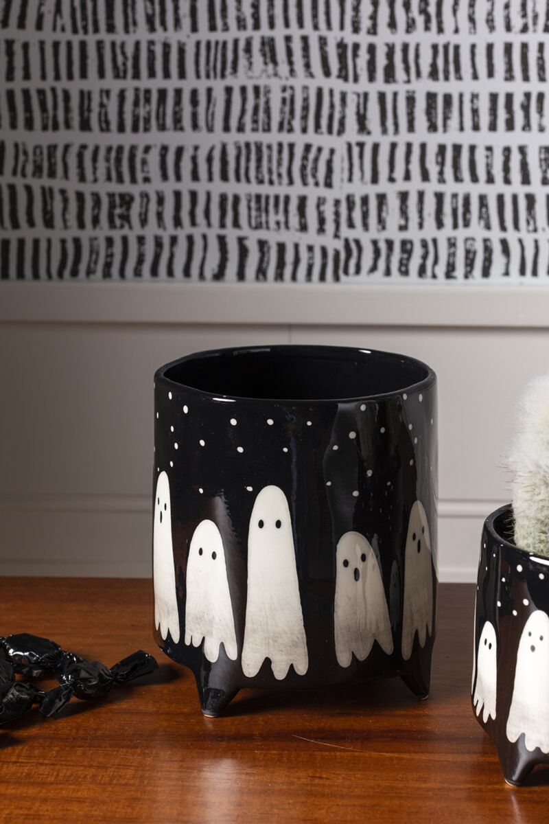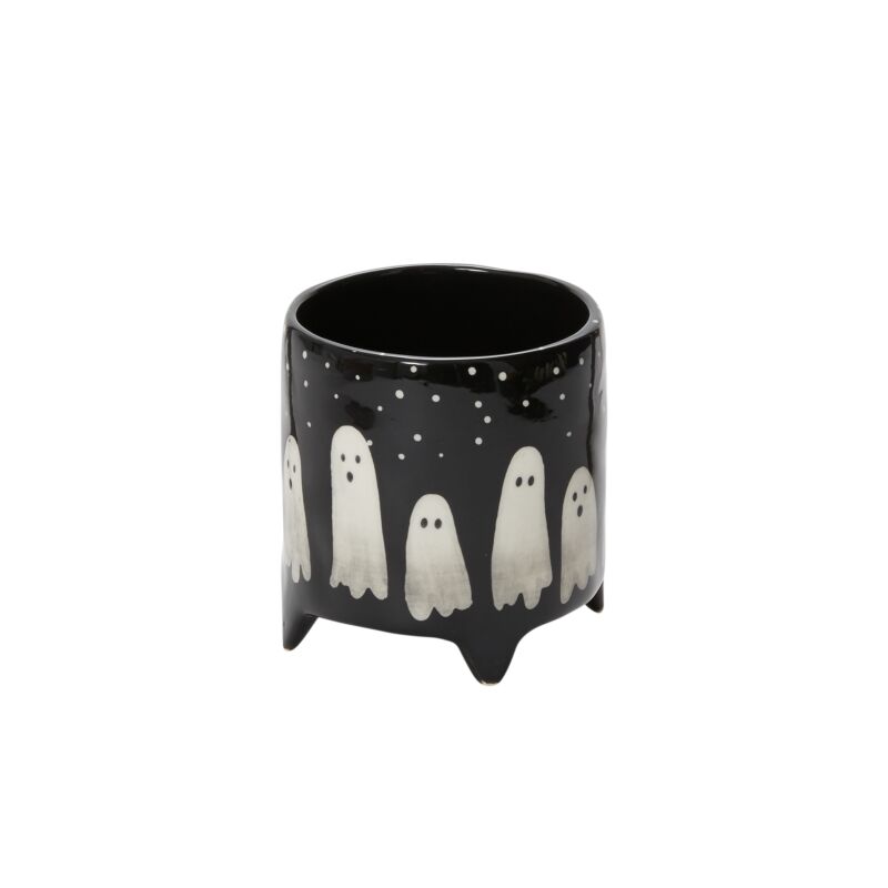 Hand painted spooky ghosts wrap around the Boo Pot, a footed container perfect for dressing up your plants. With a shiny black glaze on stoneware, the Boo Pot can hold a 4.5" or a 3" drop in plant.