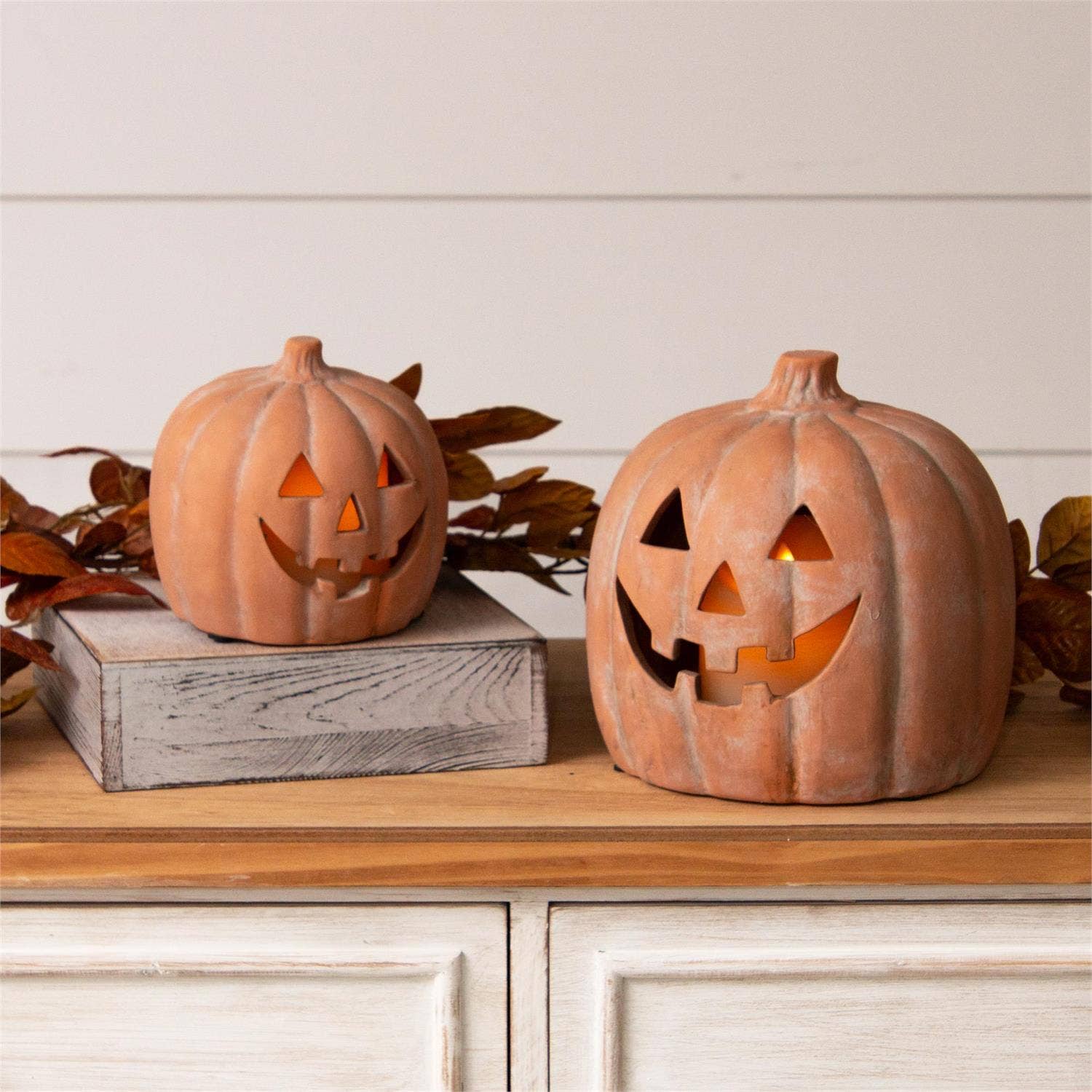 This ceramic pumpkin pair brings cozy autumn charm to Fall & Halloween displays. This large and small jack-o’-lantern (7" and 5" tall) is classic & timeless year after year. Made of ceramic with cut-out faces—just add a tealight or string lights for a warm seasonal glow. Durable, reusable, and perfect for fall shelf refreshes. Ceramic | Lights Not Included 7" H x 7.5" Dia, 5" H x 5" Dia. Pkg Desc: