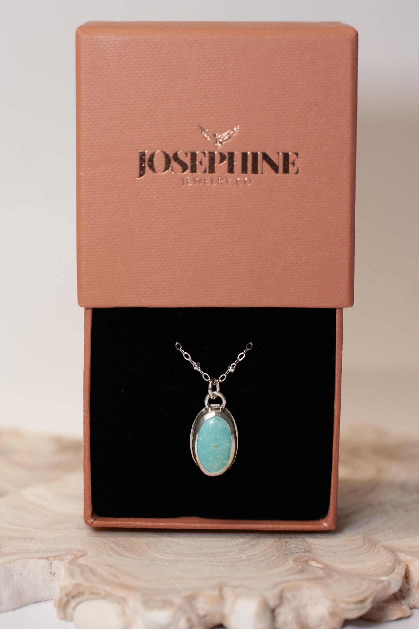 A one-of-a-kind Carico Lake Turquoise stone set in our signature Josephine Jewelry Traveler's Setting, crafted in 925 sterling silver. This timeless piece includes a 16" chain with a 2" extender for adjustable length. Packaged in a custom Josephine Jewelry keepsake box, it also comes with a polishing cloth to keep your silver shining bright for years to come.