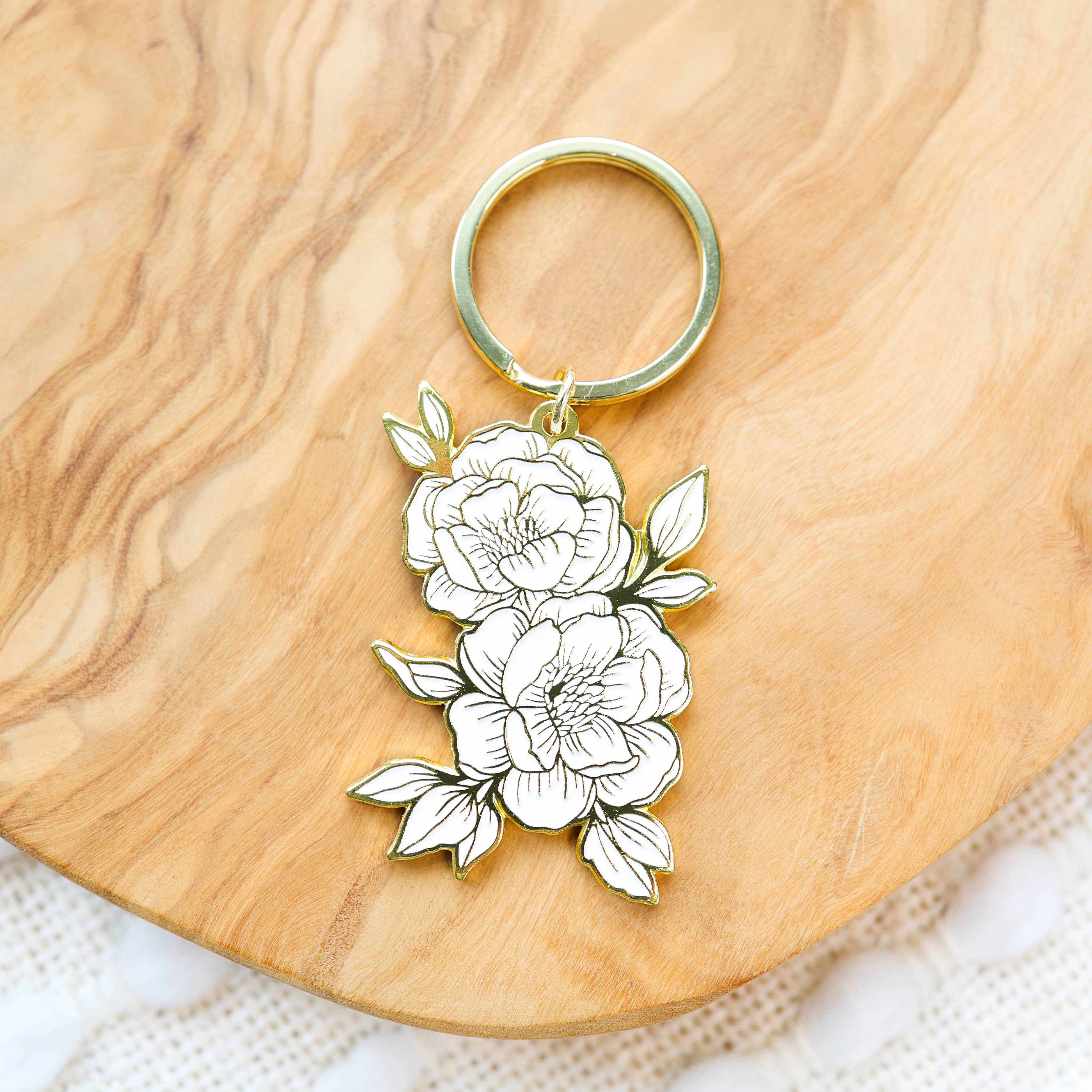 Line Drawn Peonies Metal Keychain 2.5x1.5 in.