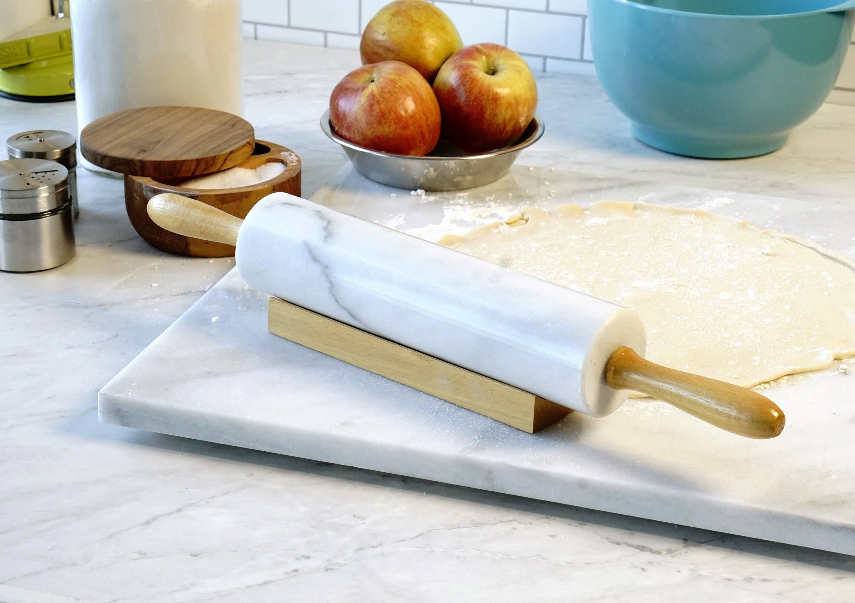 RSVP strives to offer quality kitchen products and cooking tools at competitive prices. This rolling pin is a perfect example. Constructed from marble, it's sturdy and keeps your dough cool. It comes with a wooden slab stand to easily keep this rolling pin on display and from rolling around the counter. This marble rolling pin has a grey, polished finish with wooden handles. The polished finished is designed specifically for keeping dough cool while you work. This rolling pin's heavy, efficient design ensures reliability and makes it a must have for any baker. Pin measures 1-inches in length. Hand washing recommended. When all the right people, and ingredients, kitchen tools, and food come together, we call this The Art of Gathering.