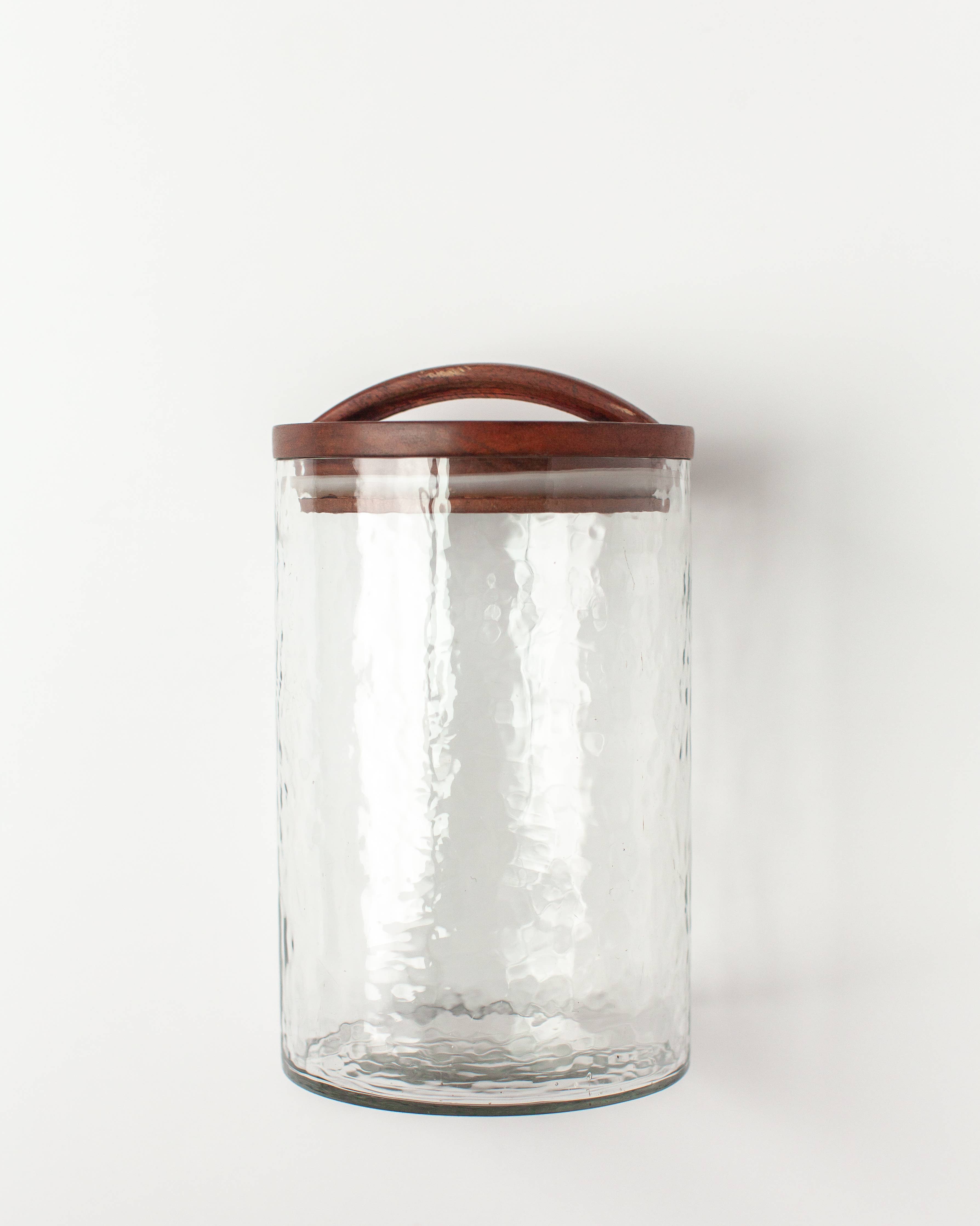 Handblown then meticulously hammered by hand, these recycled glass canisters feature a beautiful pebbled texture and deep, earthy colors. They are topped with a striking hand-carved lid made from FSC certified mango wood. Each takes hours to make using skills passed down through generations.