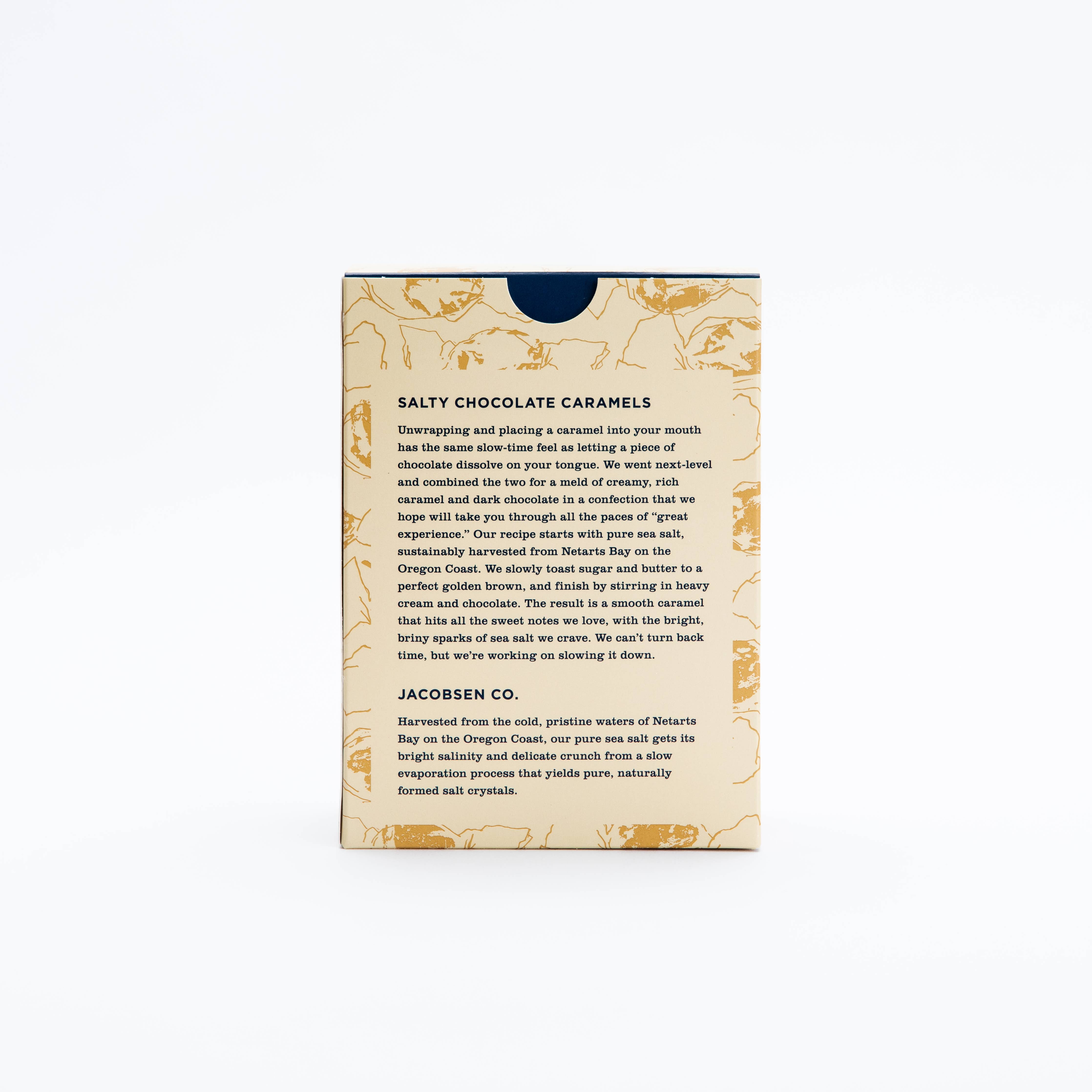 Unwrapping and placing a caramel into your mouth has the same slow-time feel as letting a piece of chocolate dissolve on your tongue. We went next-level and combined the two in a recipe that starts with pure sea salt harvested from Netarts Bay on the Oregon Coast. We then slowly toast sugar and butter to a perfect golden brown, and finish by stirring in heavy cream and chocolate. The result: a smooth caramel that hits all the sweet notes we love, with the bright, briny sparks of sea salt we crave. Unit Net Weight: 6.5 oz box Unit Dimensions: 6" x 4.5" x 2.5" Best Before: