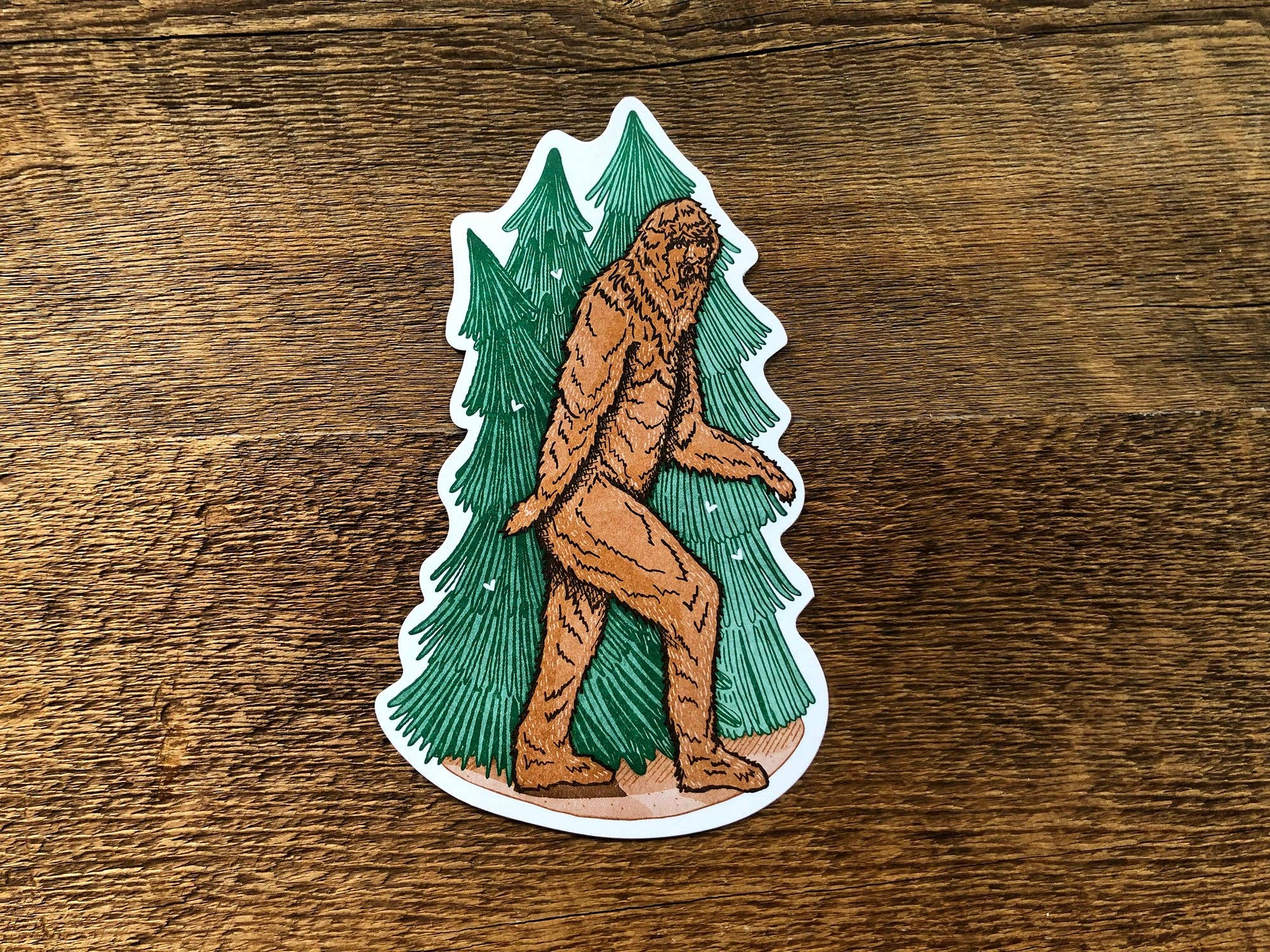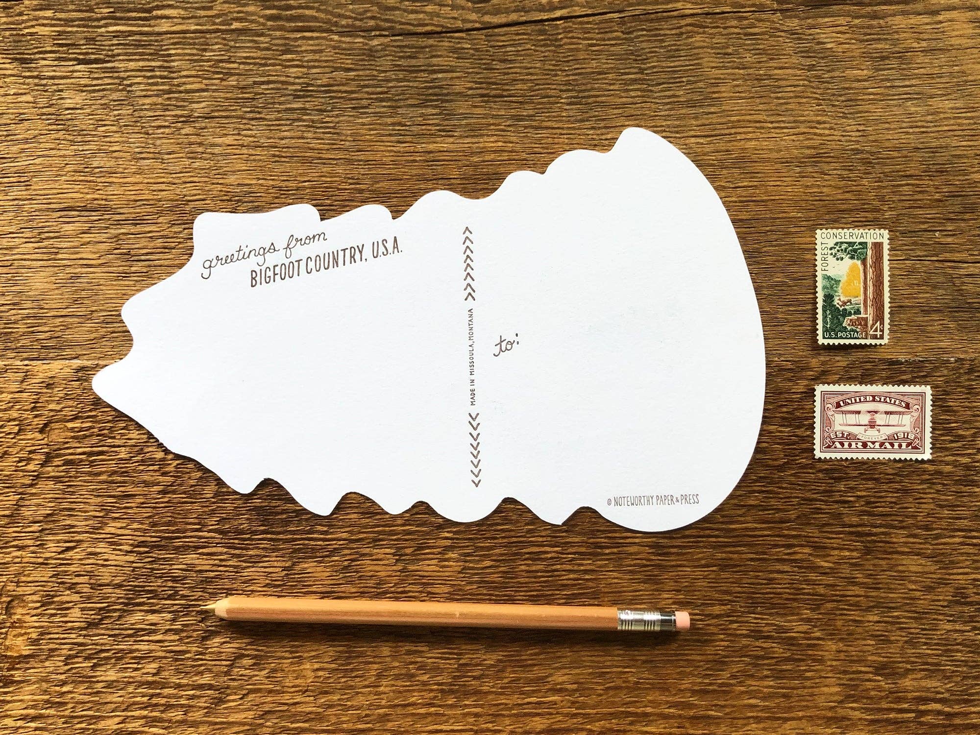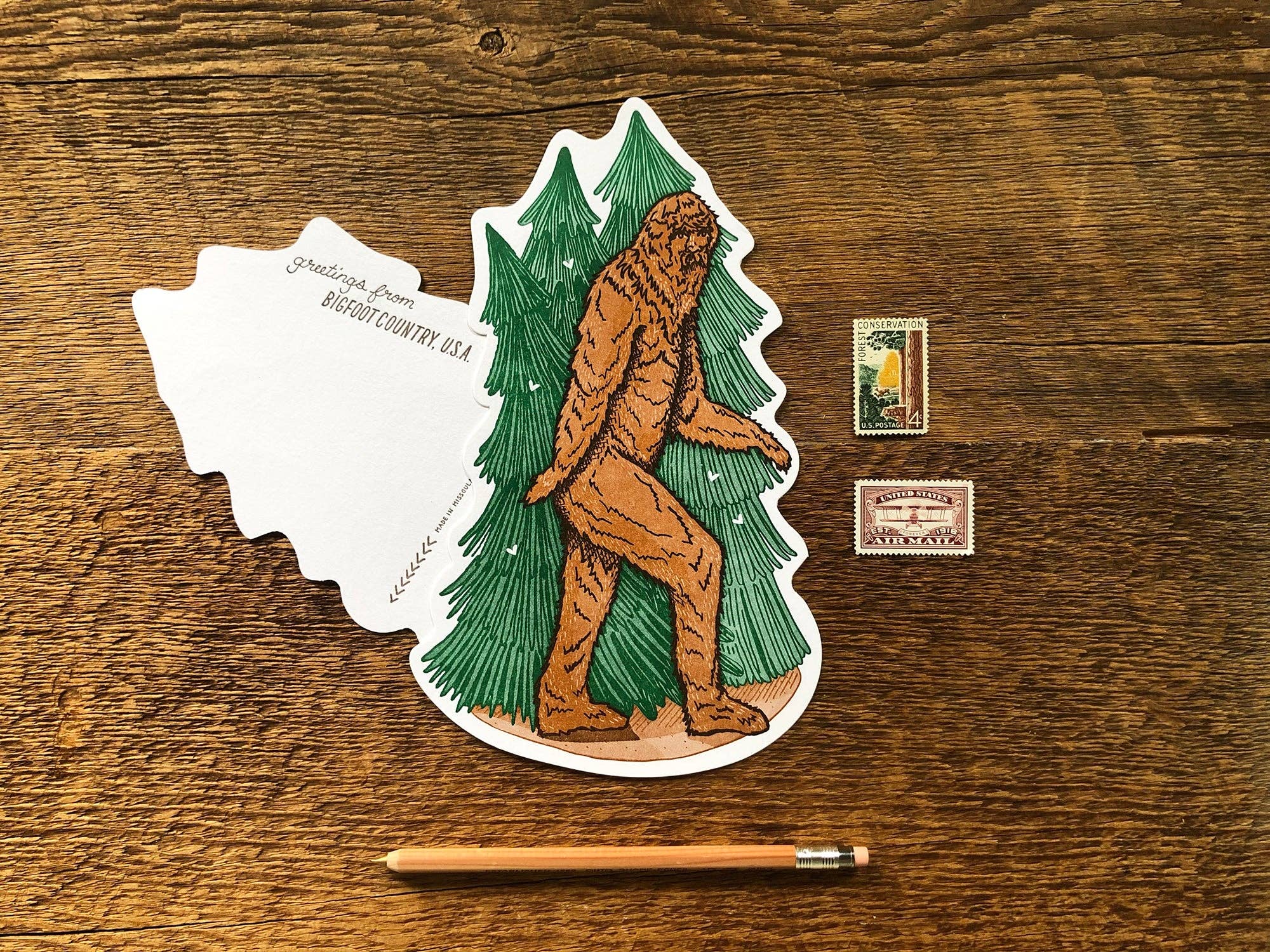 Image Description: a letterpress and die cut postcard of a brown bigfoot in front of large pines behind them, little bugs fly around them