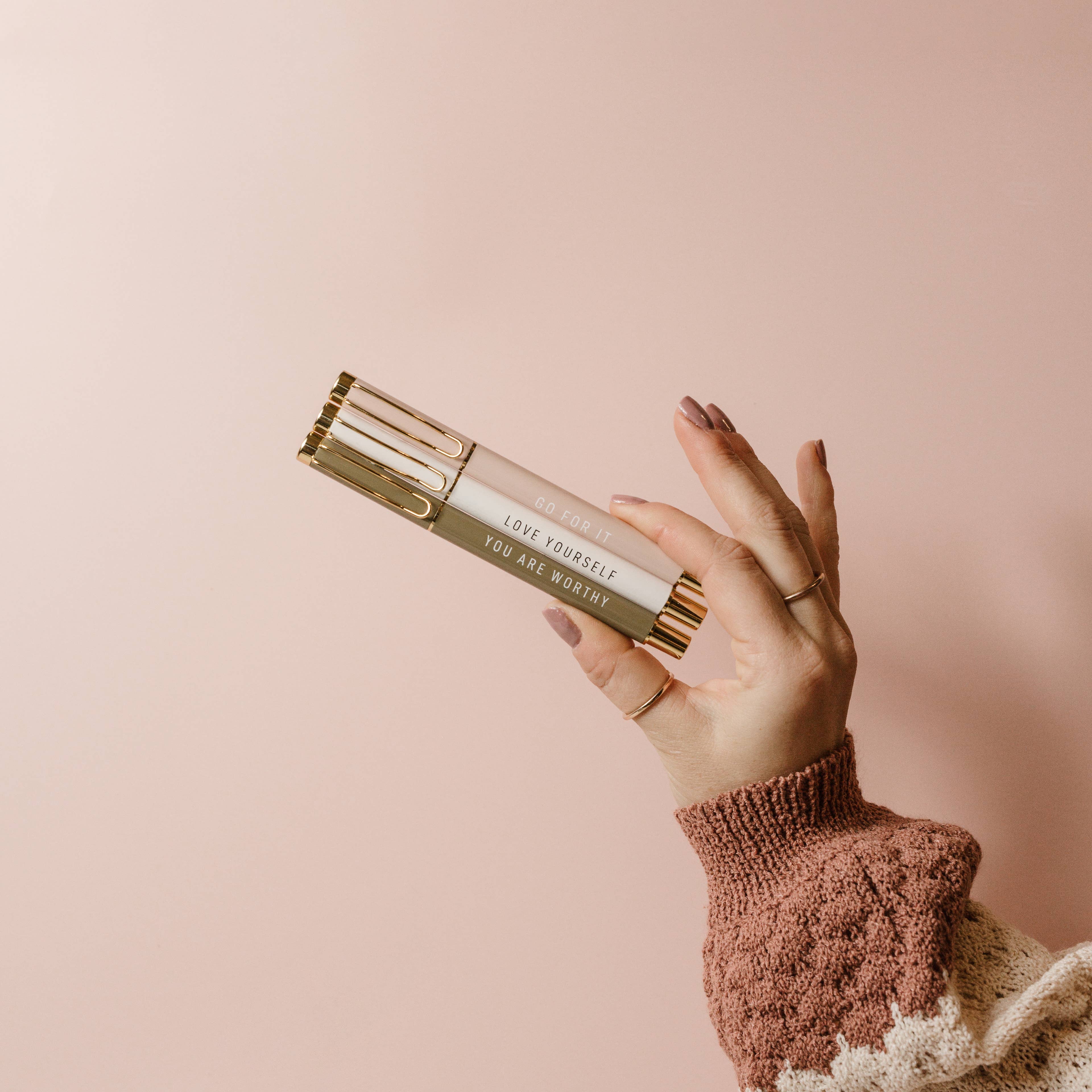 Elevate your writing experience with the Go For It Metal Pen Set, designed to inspire and empower every stroke. This stylish collection features three medium ballpoint pens in elegant shades of blush pink, olive green, and ecru, each adorned with motivating messages—Go For It, You Are Worthy, and Love Yourself—in striking white or black lettering complemented by refined gold accents. Crafted for comfort and precision, these pens use high-quality black ink refills compatible with Parker medium ballpoint cartridges, ensuring smooth, consistent writing. Perfectly sized at 5.37 inches and packaged in a sleek clear box (2.37” x 6.25” x 0.75”), this set is an ideal gift or addition to your curated collection alongside matching devotionals, notebooks, and mugs. Thoughtfully designed in the USA, the Go For It Metal Pen Set creatively blends form and function to inspire daily confidence and productivity.