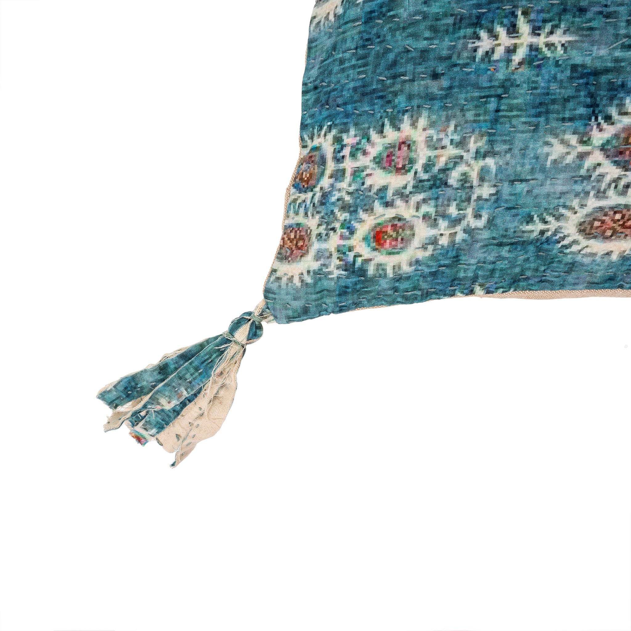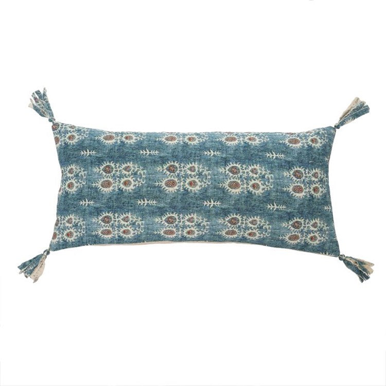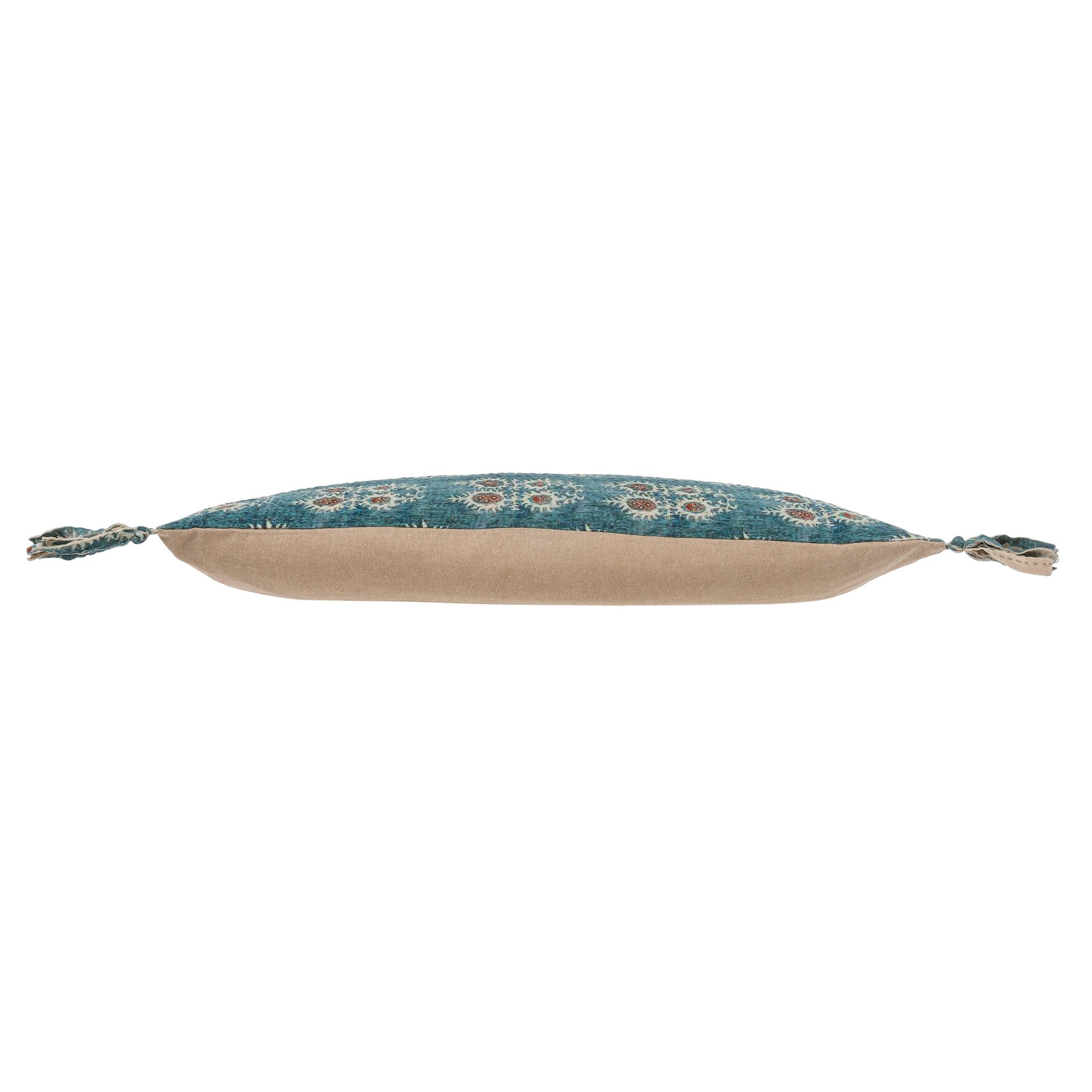 Add that bright and airy vacation feeling to your home with the ocean blue and burnt sienna accents of the richly patterned Bluebell Lumbar Pillow. Trimmed with unique tassels, this handcrafted accent pillow comes complete with a premium feather down filler for fabulous fluff factor and comfort you'll want to sink your head into. Machine Wash Gentle.