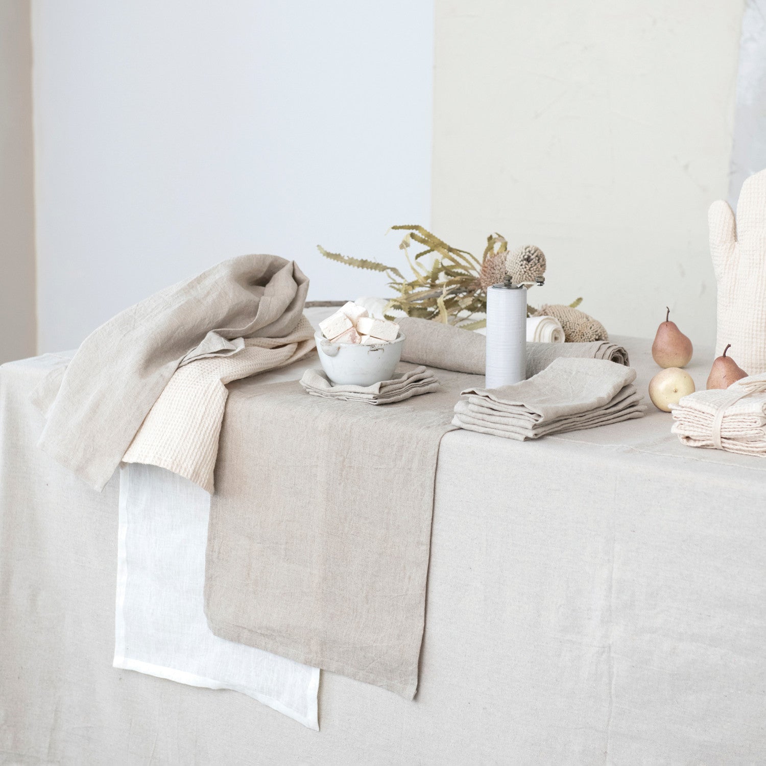For those who love to entertain and impress their guests, a collection of textiles that can add some style and flair to the kitchen and dining table is essential. Whether they want to protect their clothes, hands, and surfaces from spills and heat, or create a stunning table setting with napkins and runners, there are the perfect textiles for them. They can choose from a wide range of shapes, sizes, designs, and materials such as cotton, linen, polyester, and bamboo. They can mix and match them to create their own unique style or choose a matching set for a harmonious look. No matter what they choose, they can be sure that the textiles are high-quality, durable, and easy to clean. Crafted with care, this table runner in a soft ivory color adds an elegant touch to every table setting, making every occasion special. Composed of pure linen fabric. This table runner is free from knots, stripes, or elaborate prints, allowing it to effortlessly complement a variety of table settings. This versatile 108-inch table runner is perfect for both casual gatherings and formal events, making it an ideal choice for adorning longer tables used in parties, weddings, or family celebrations.