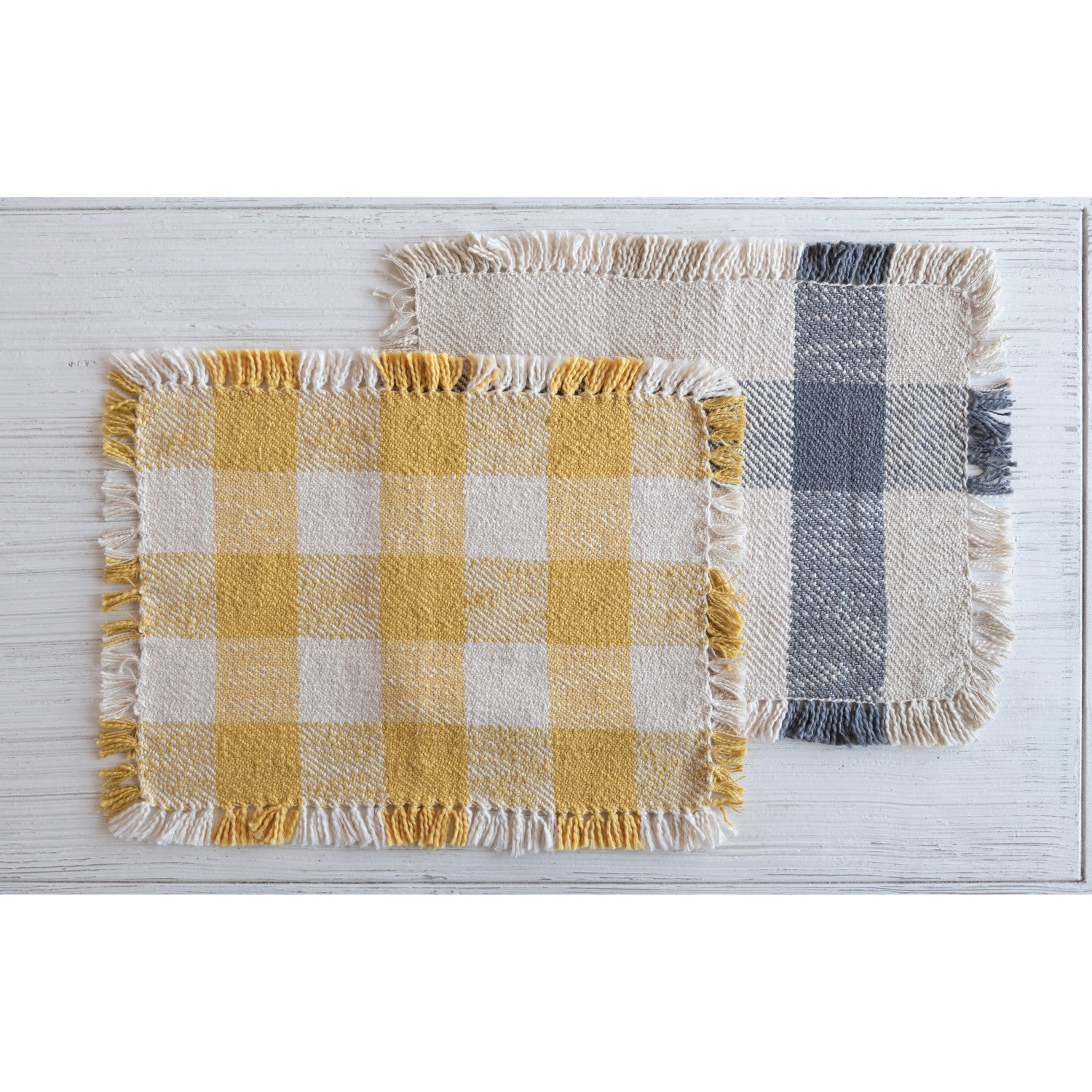 Multicolor woven cotton placemat with buffalo check and fringe; Machine Wash Cold, Gentle Cycle, Do Not Bleach, Warm Iron If Needed. Add a touch of style to any kitchen or dining space with this elegant placemat. Made from 100% cotton. Curate a space that reflects your unique sense of style with intentionally designed home décor.