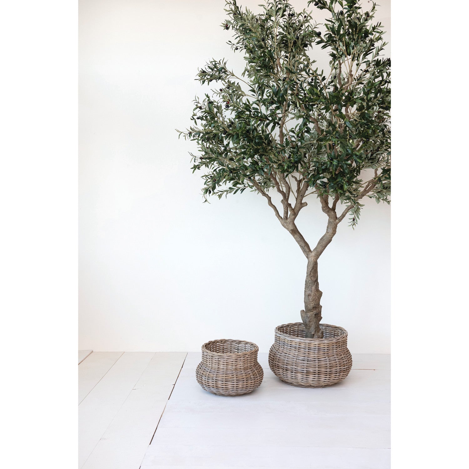 This set of two round planters is a beautiful and practical piece that will enhance the home's natural charm. The planters are made of grey hand-woven rattan, an eco-friendly and durable material that skilled artisans weave. The rattan has a grey color that adds a modern and elegant touch to the space. The planters have a round design that complements any shape of plants. The planters also have handles that make them easy to carry and move. Use them to display plants on any surface or setting, where they will create a fresh and inviting atmosphere with their versatile and spacious design. Whether used for flowers, herbs, succulents, or other plants, this set of two round planters will add a touch of natural beauty and sophistication to any space. The largest size measures 24.75 inches in diameter and 15.75 inches in height. Keep any items organized and stylish with these versatile and spacious baskets.