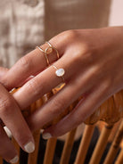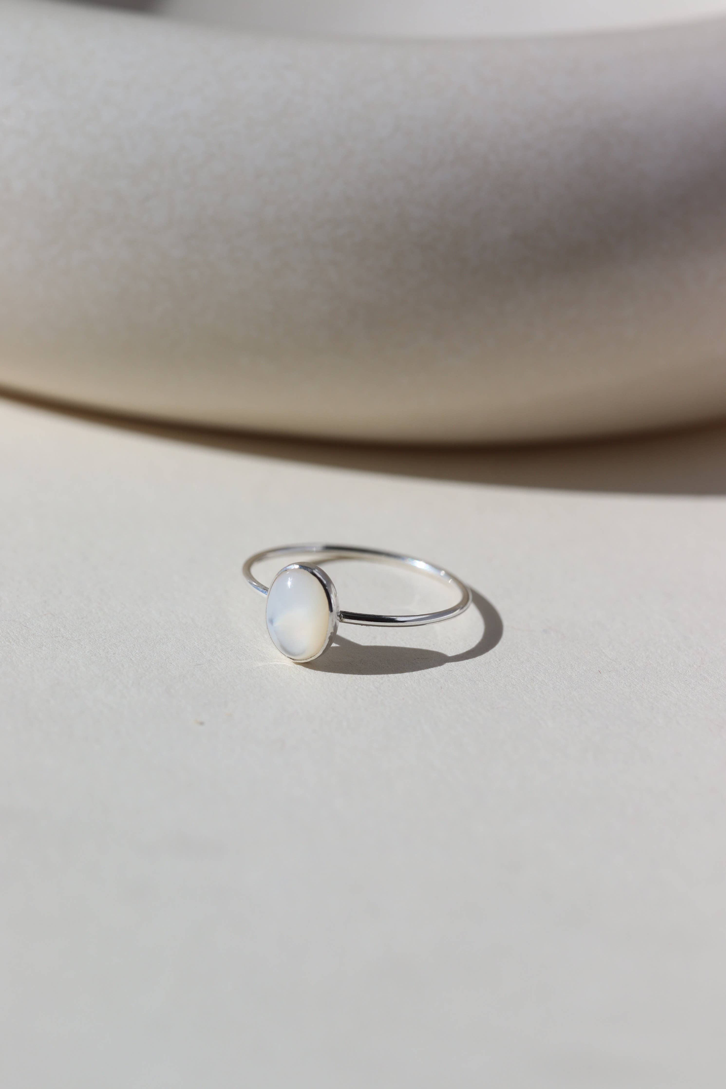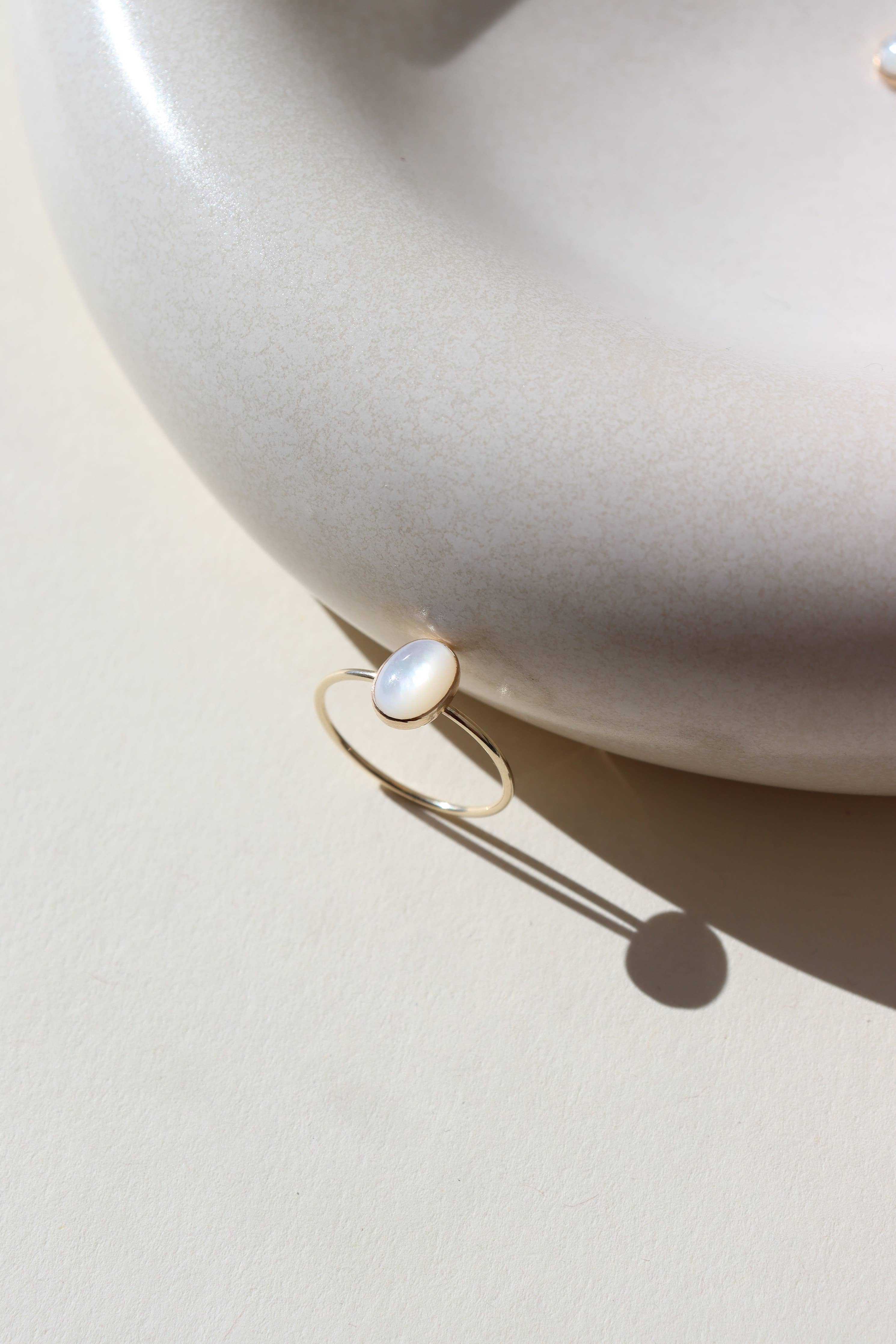 Experience the beauty of the Aurelia Ring. This stunning ring features a hand-set oval mother of pearl cabochon, encased in your choice of 14k gold filled or sterling silver bezel. A timeless ring for someone who embraces minimal, everyday pieces.