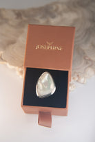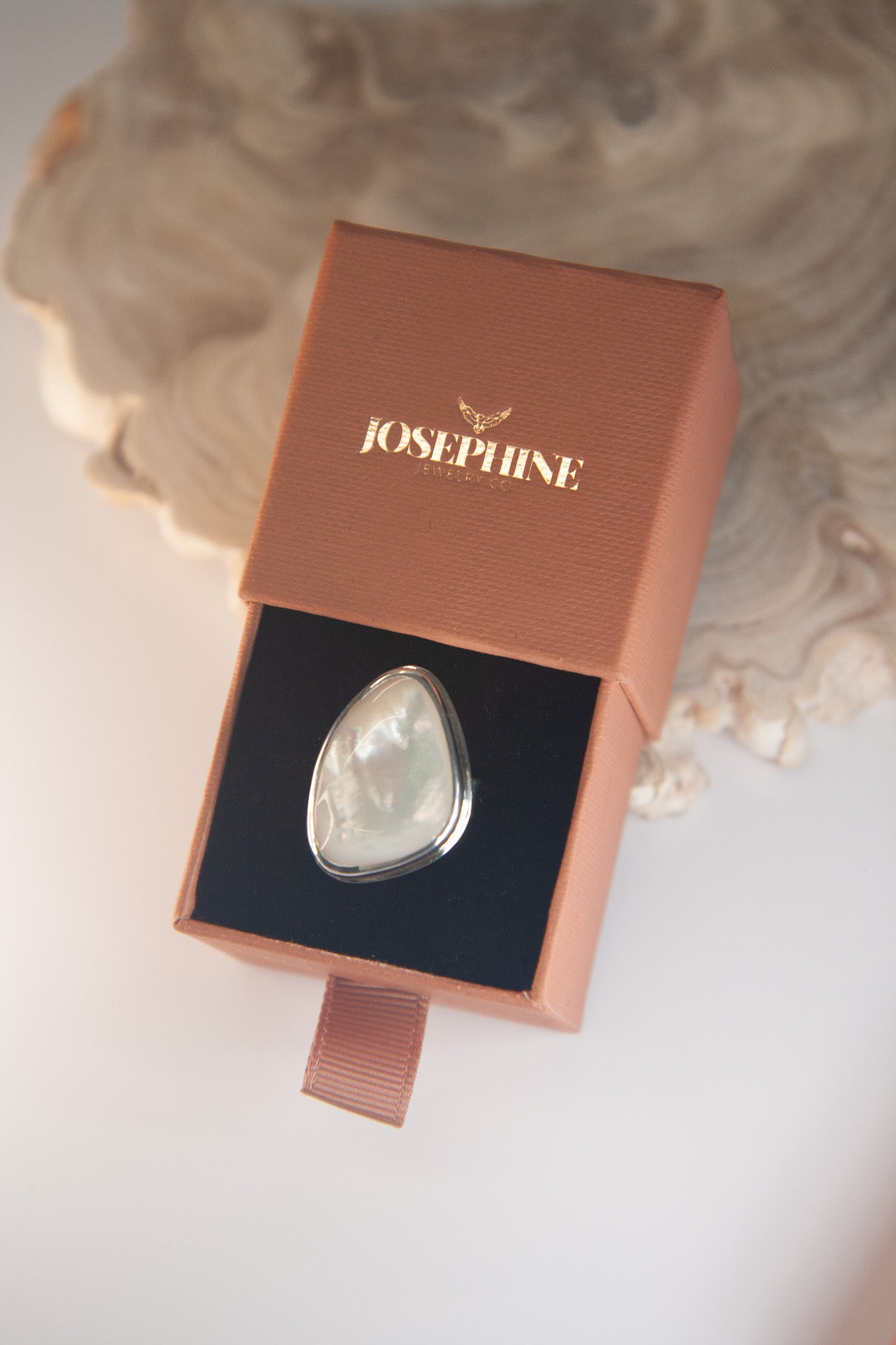 Elegant and timeless, this Mother of Pearl ring is set in our signature Josephine Jewelry Traveler's Setting and finished with a polished 925 sterling silver band. The soft iridescence of the stone catches the light beautifully, offering a subtle yet captivating glow. Each ring comes nestled in a custom Josephine Jewelry keepsake box, along with a polishing cloth to help maintain its natural luster.