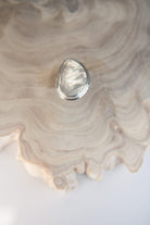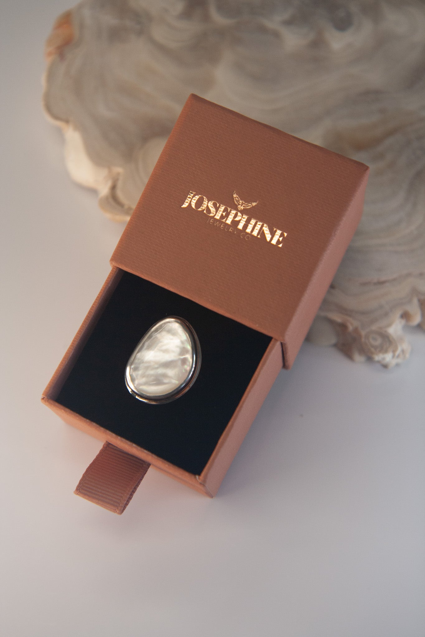 Elegant and timeless, this Mother of Pearl ring is set in our signature Josephine Jewelry Traveler's Setting and finished with a polished 925 sterling silver band. The soft iridescence of the stone catches the light beautifully, offering a subtle yet captivating glow. Each ring comes nestled in a custom Josephine Jewelry keepsake box, along with a polishing cloth to help maintain its natural luster.