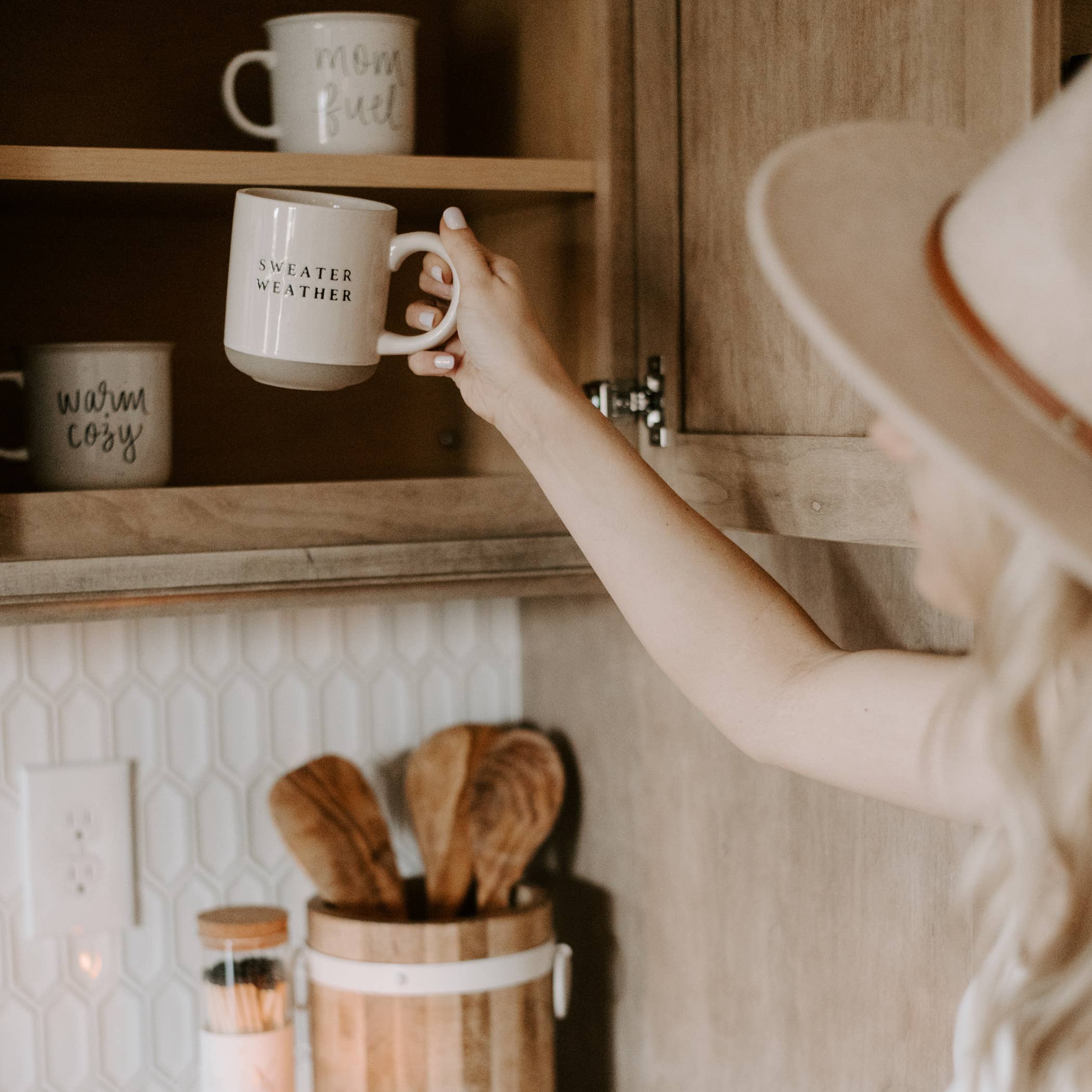 This 14oz stoneware mug features the original Sweater Weather design on both sides, with cream and black lettering accented by a speckled pattern and natural bottom details. Measuring 3.31 x 3.93" (5.19" including handle), each hand-crafted piece is uniquely distinct due to slight variations. Designed in the USA and imported, it is microwave and dishwasher safe. For best care, wash before first use and avoid abrasive cloths; handle with care when removing from the microwave.