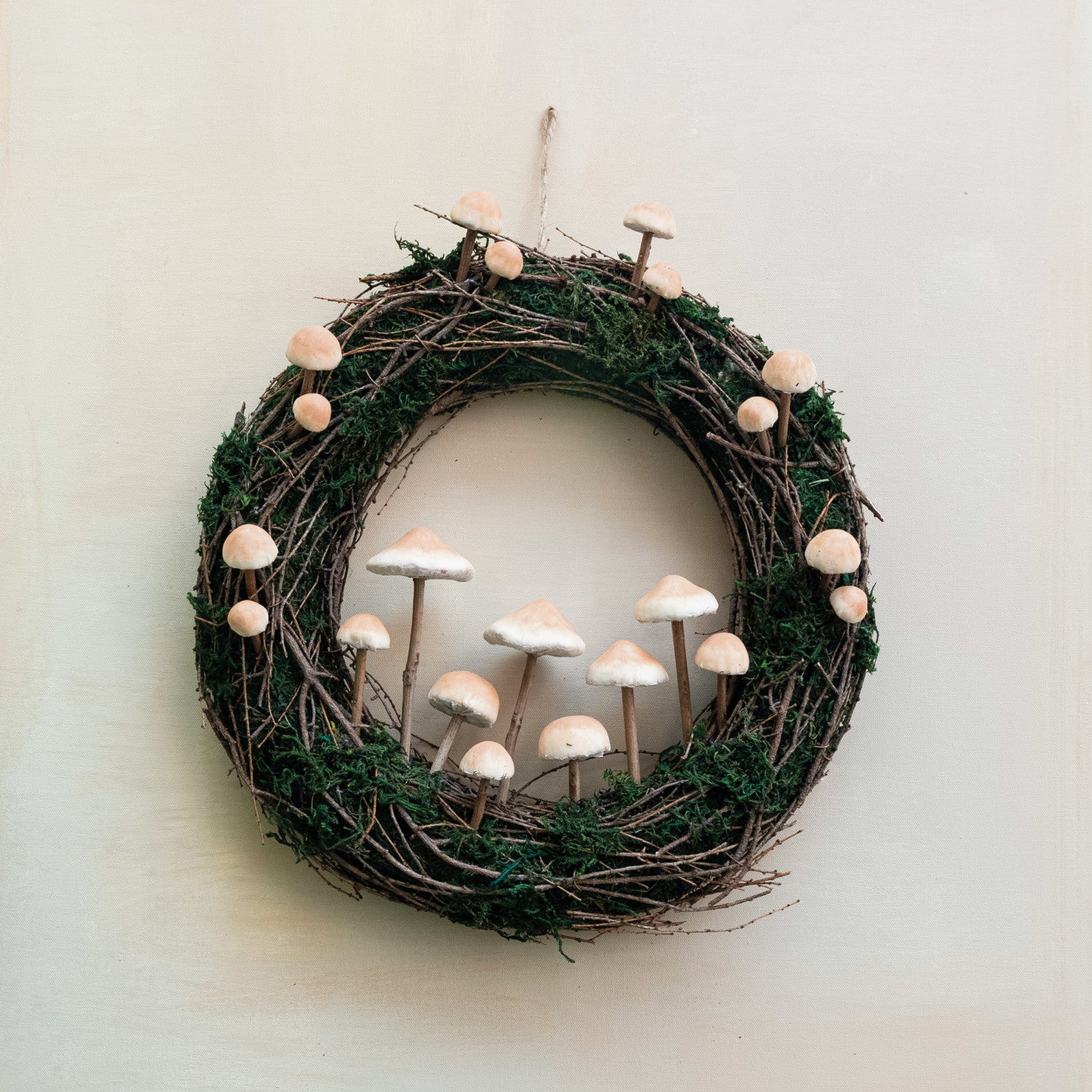 This beautiful twig and moss wreath with foam mushrooms brings the beauty of nature indoors. Handcrafted from natural twigs and moss, this wreath exudes rustic elegance with a touch of whimsy thanks to the realistic-looking foam mushrooms in natural and tan colors. Hang it on the front door to welcome guests or display it inside to add a touch of warmth and character to any room, as this wreath is sure to create a warm and inviting atmosphere. Perfect for year-round display or to add a natural element to fall décor, this versatile wreath complements a variety of styles. Measuring 17.75 inches in diameter, it creates a stunning statement. A charming 17.75-inch wreath handcrafted from natural twigs and moss for a touch of rustic elegance. Accented with realistic-looking foam mushrooms in natural and tan colors for a whimsical touch. Creates a warm and inviting atmosphere for the front door or interior spaces.