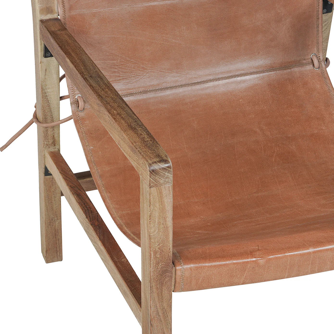 The Urban Sling Chair is a comfortable classic inspired by British Colonial designs. This armchair features a modern, open Acacia wood frame that is bleach-finished. The coffee-colored leather seat-and-back "sling" give the Urban Sling Chair a laid-back sophistication. This neutral-toned chair works well in small, modern, or eclectic décors.
