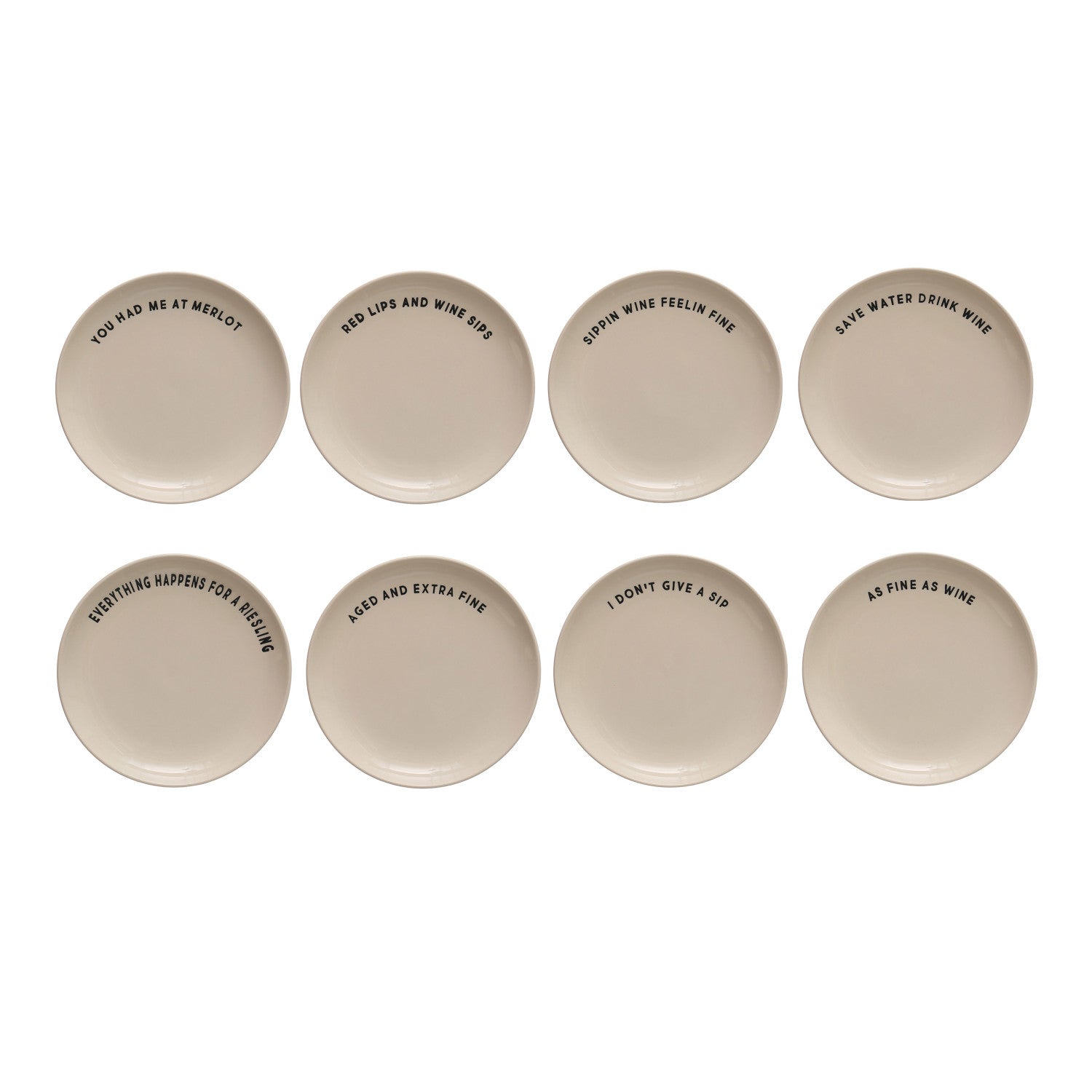 Elevate your dining experience with these 6" round stoneware plates, meticulously crafted in white with black wax-relief accents showcasing charming wine sayings. Each plate combines durable stoneware material with artistic embossing, making them perfect for serving appetizers or desserts while sparking conversation. Their timeless design and expert craftsmanship ensure long-lasting beauty and functionality, ideal for wine lovers looking to add a sophisticated touch to their table setting or wine tastings. Practical and elegant, these plates bring both style and character to any gathering.