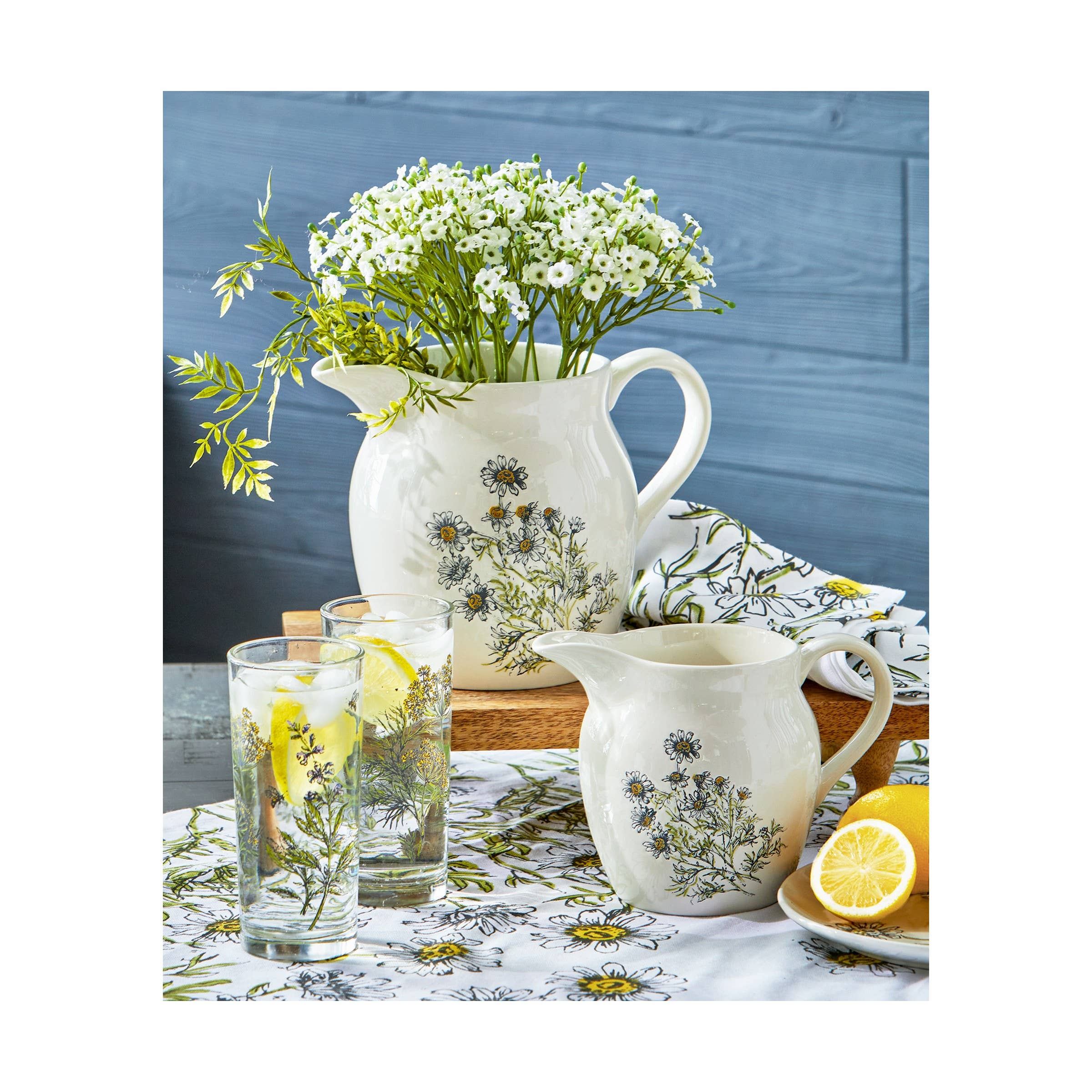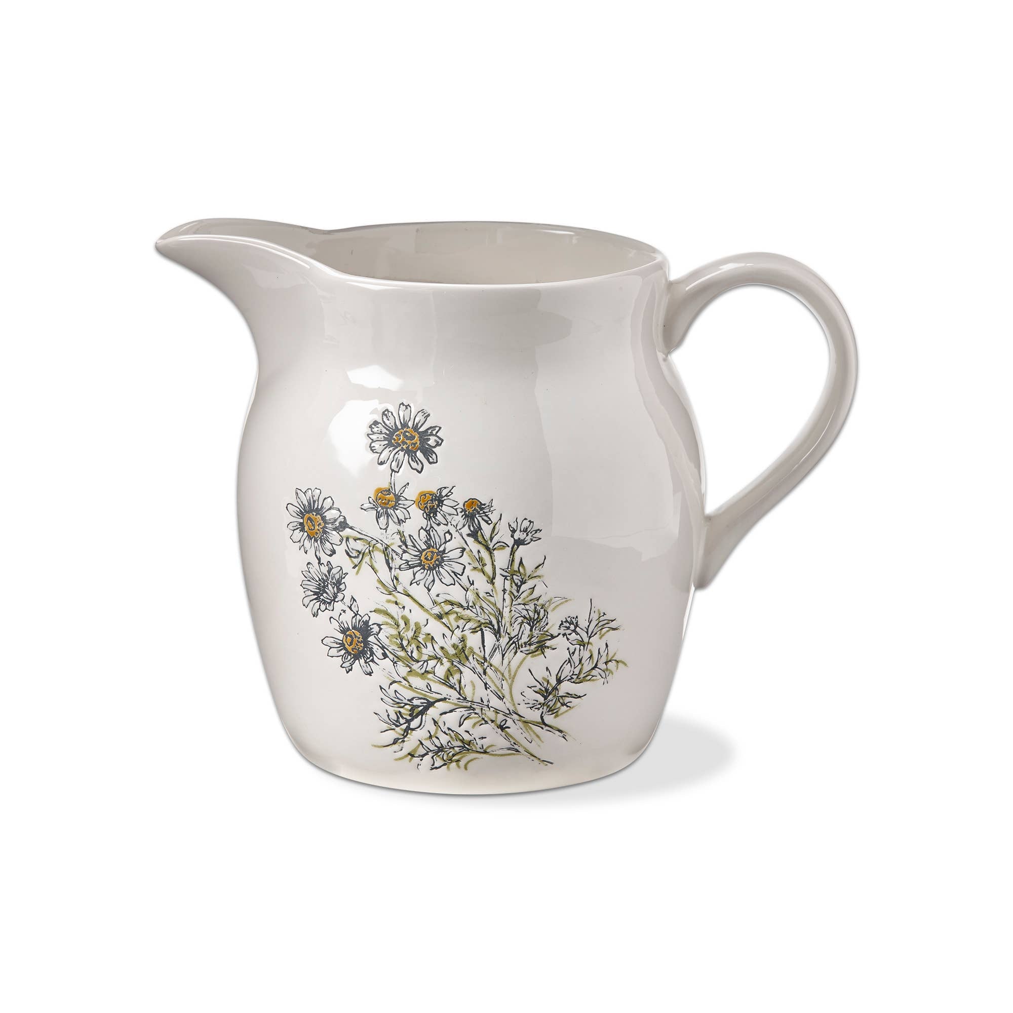 meet your new favorite party piece! this gorgeous pitcher made from earthenware is perfect for drinks or as a vase for fresh spring blooms. this piece features a hand-sculpted handle and glossy finish with a wax resist design and hand painted details. no matter what you use it for, it will be sure to elevate your table this season. Material: Dolomite Care Instructions: dishwasher safe. may get hot in microwave. oven safe up to 350 fahrenheit Size: 7 inch h x 9.5 inch l x 5.25 inch w.