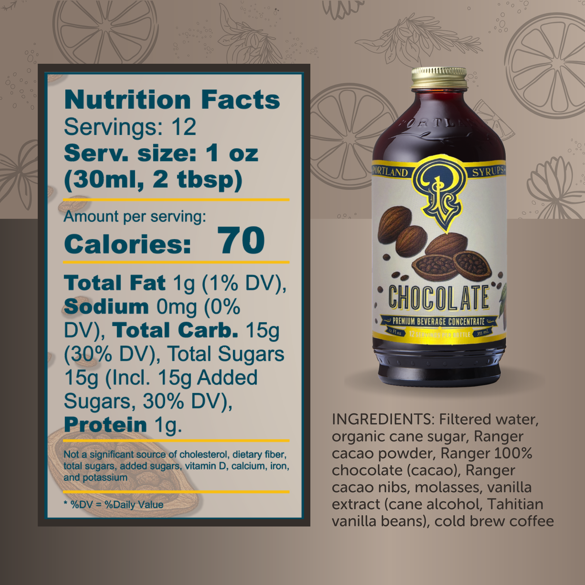 Crafted in collaboration with our friends at Ranger Chocolate Co., this syrup is pure indulgence in a bottle. Made with rich, small-batch chocolate from one of Portland’s finest chocolatiers, it delivers deep cocoa flavor with just the right touch of sweetness. Silky, bold, and versatile, it’s perfect for cozy drinks or decadent treats. One 12 oz bottle serves up to 12 drinks—your shortcut to chocolate bliss, any time of year. Case Pack: 6 units UPC: 8-50074-74601-0 Shelf Stable: 24 months Product Dimensions: H: 6.5" x W: 3" x D: 3" Certifications: Made with Fair Trade Organic Cane Sugar & whole ingredients. Usage Ideas: Stir into coffee or cold brew for a mocha-style upgrade. Mix with milk (hot or cold) for the ultimate chocolate fix. Add to bourbon or espresso martinis for dessert-worthy cocktails. Drizzle over pancakes, ice cream, or fresh berries.