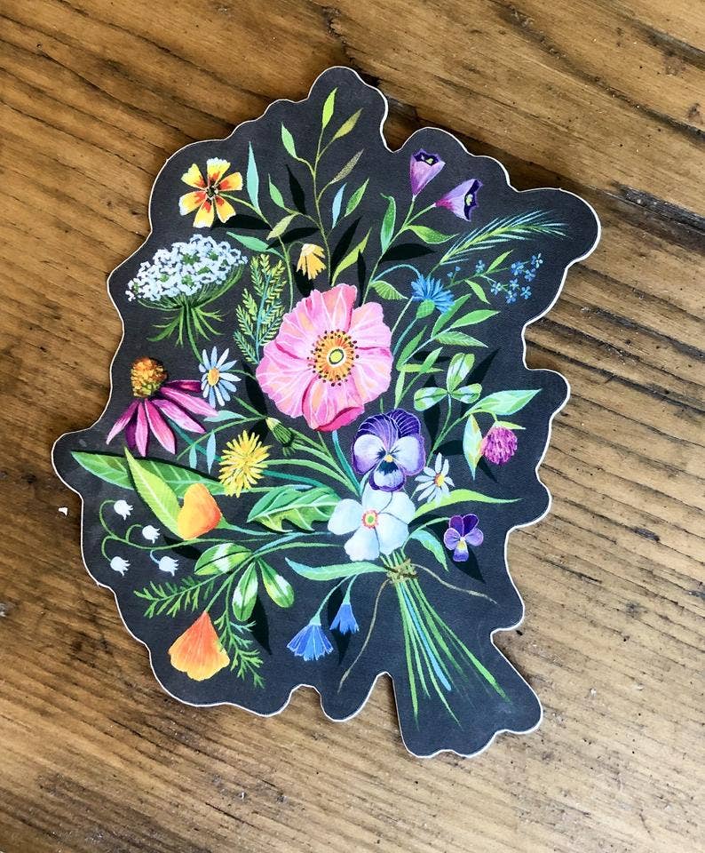 Adorn your laptop, cell phone case, notebook, car, or just about anything that might need a little extra beauty! This die-cut, matte laminated sticker measures 3.14″ x 4″ and is printed at the highest quality! Background of sticker is a dark gray with vibrant florals :)