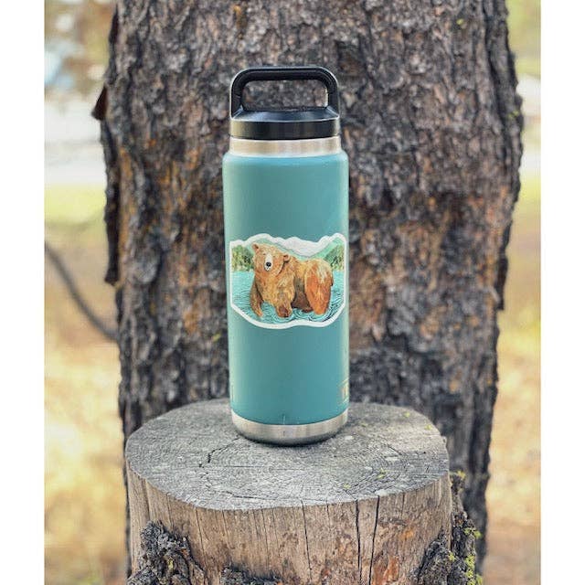 Glacier Grizzly sticker is a reproduction of an original gouache painting of a grizzly bear wading in Lake McDonald in Glacier National Park. Premium laminated die cut vinyl sticker with a matte finish. High quality production - it holds up to water very well making it perfect to use on water bottles, lunchboxes, cars, cell phone cases, cargo containers, coffee tumblers, laptops and anywhere else that it might bring you joy! Sticker measurements: 2.75" tall by 4" wide