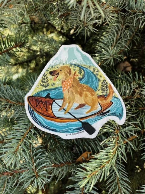 Paddle Board Pup sticker is a reproduction of an original watercolor painting that showcases a golden retriever paddle boarding the Deschutes River in Bend, Oregon with Mount Bachelor in the distance. A perfect sticker for a laptop or coffee tumbler for any outdoorsy, adventuring, dog-loving individual like myself. Premium laminated die cut vinyl sticker with a matte finish. High quality production - it holds up to water very well making it perfect to use on water bottles, lunchboxes, cars, cell phone cases, cargo containers, coffee tumblers, laptops and anywhere else that it might bring you joy! Sticker measurements: 3.5" tall by 3.5" wide