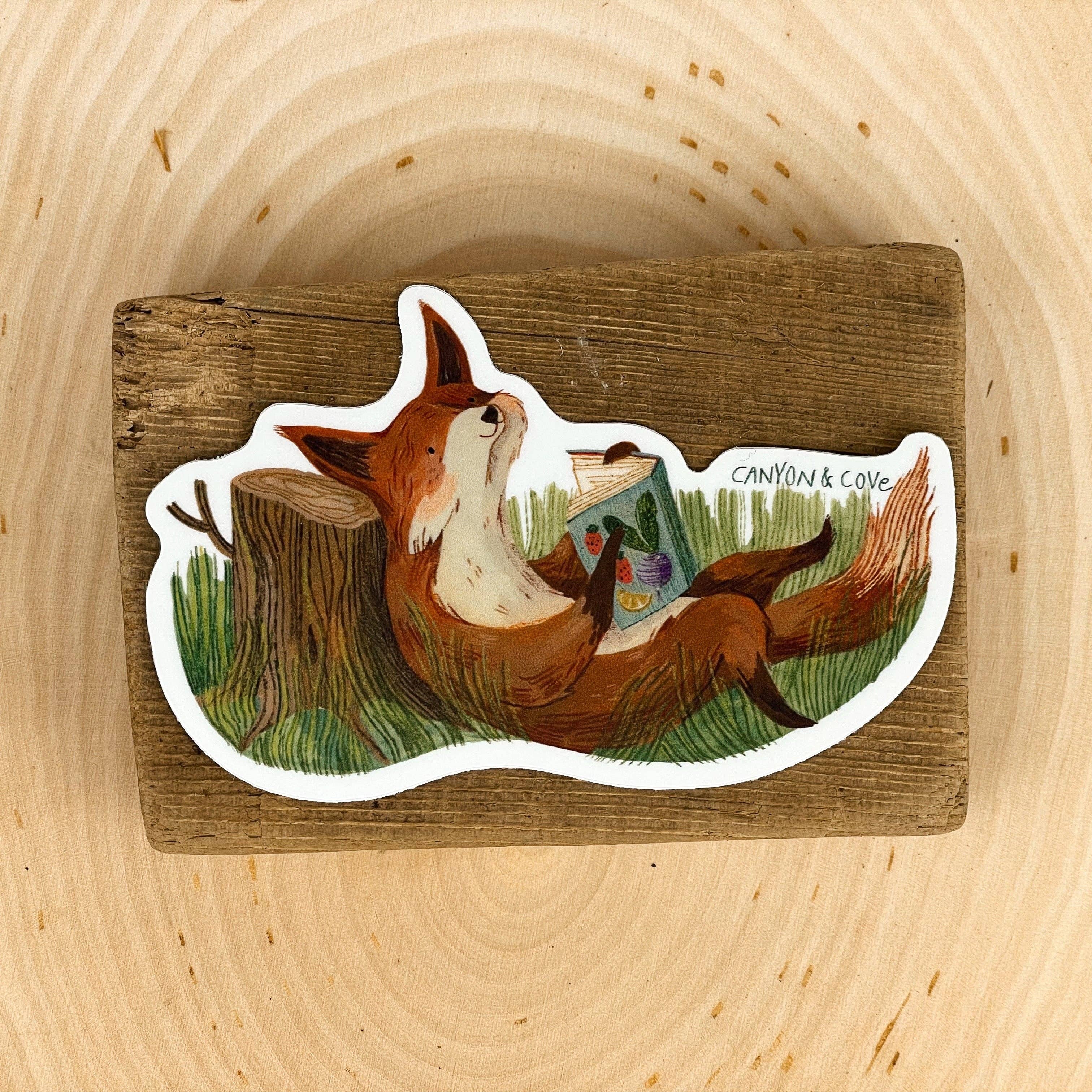 Reading Fox Sticker Premium laminated die cut vinyl sticker with a matte finish. High quality production - it holds up to water very well making it perfect to use on water bottles, lunchboxes, cars, cell phone cases, cargo containers, coffee tumblers, laptops and anywhere else that it might bring you joy! Sticker measurements: 2.75" tall by 4” wide