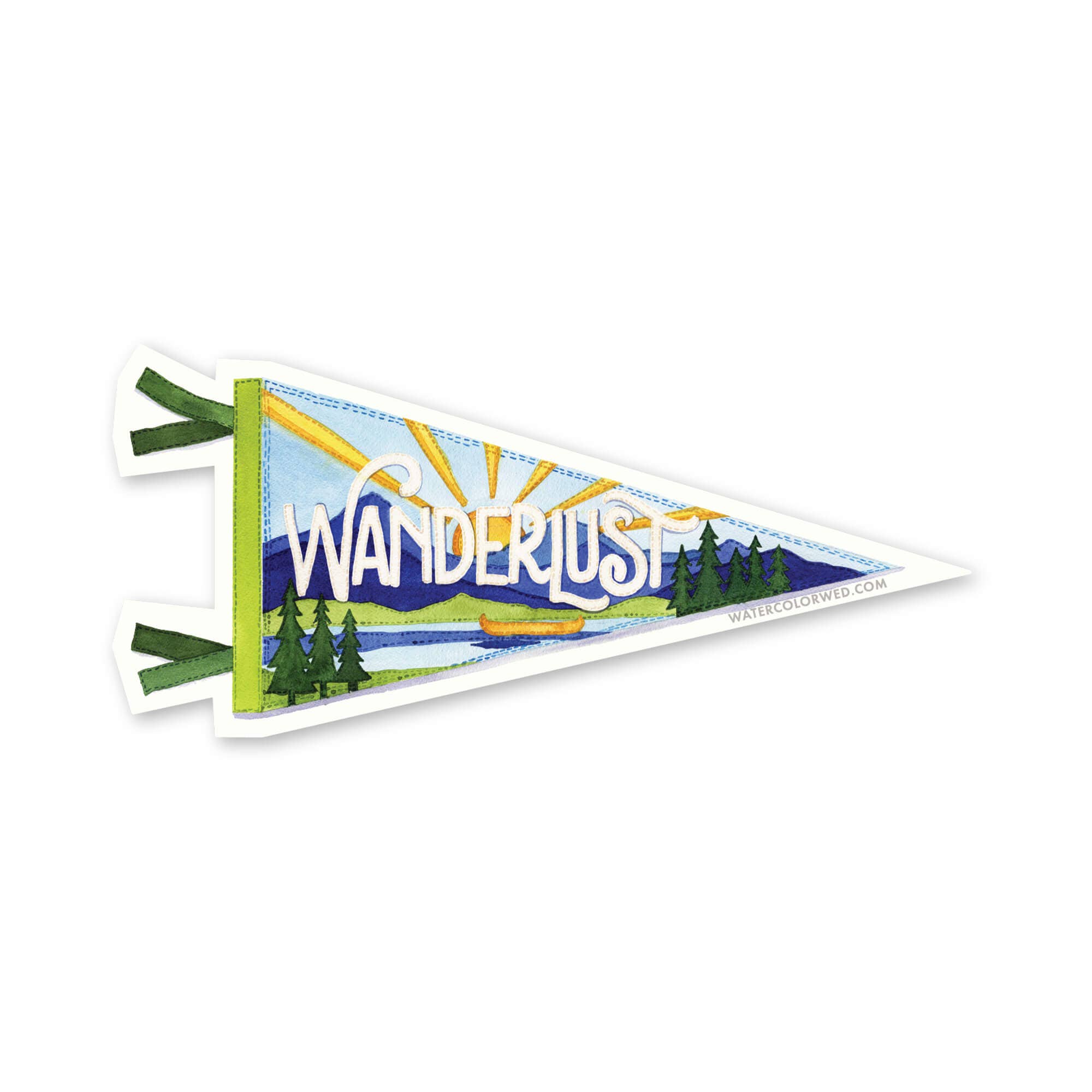 Rediscover the spirit of adventure with our 'Wanderlust' Vintage Camp Pennant Vinyl Sticker, a charming sticker that beautifully blends nostalgia and wanderlust. This meticulously hand-painted creation, designed to resemble hand-sewn felt, features a serene lakeside scene with a canoe, trees, and a tranquil sunrise, making it a perfect addition for those who appreciate the timeless art of exploration and the cozy charm of vintage camp pennants. Remember not all who wander are lost!