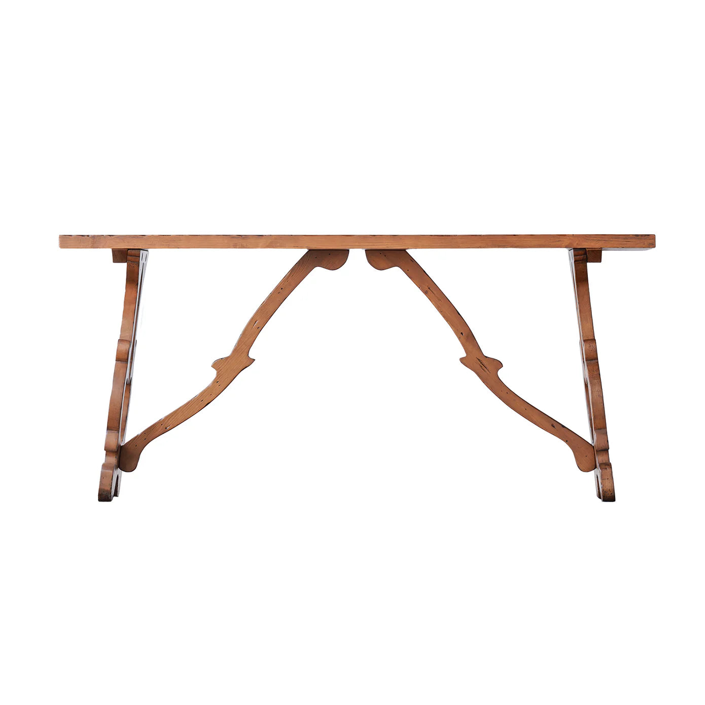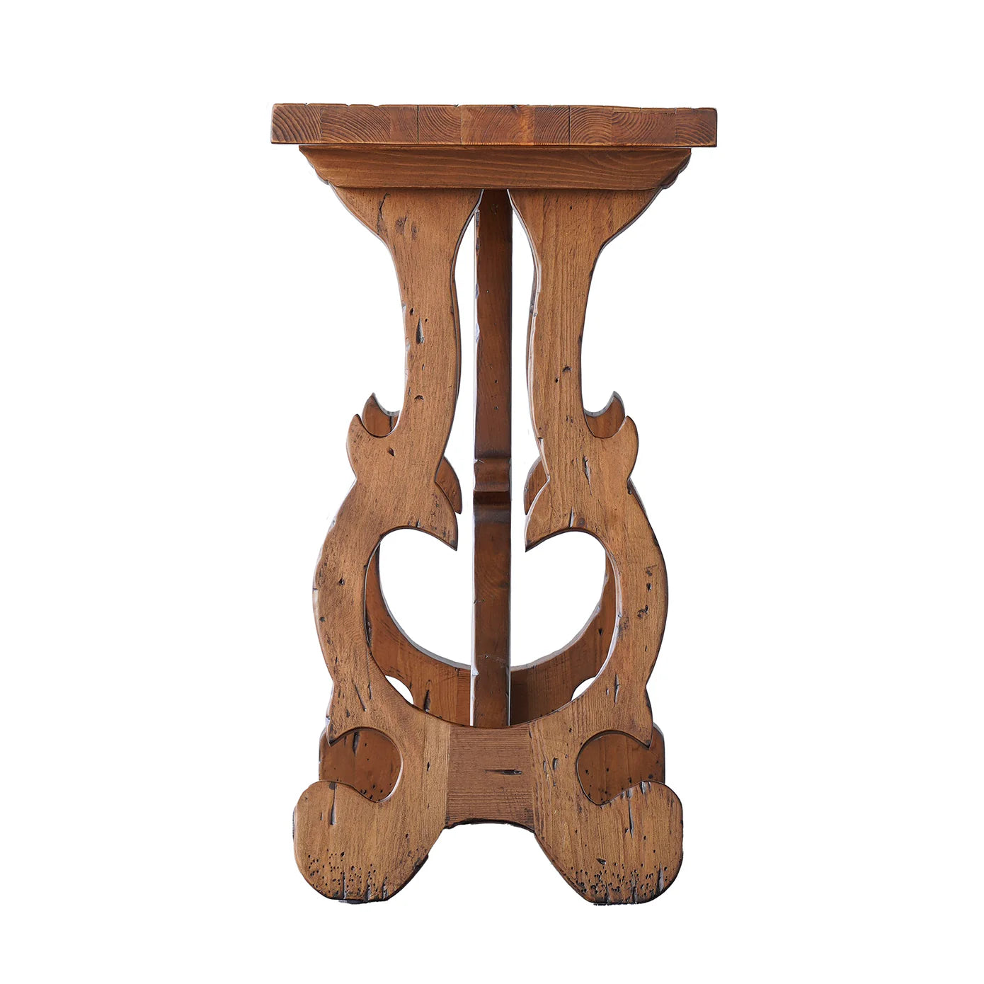 The Sevilla Tables are denoted by their historical, artisan legs. Newly crafted from pine wood, the Sevilla Console Table has angel-harp-like leg supports that run vertically along both ends of the table. The gentle, undulating curves of the legs are supported by an organically shaped pine arm on each side.  The Sevilla Console Table stands tall and is a great showcase piece in narrow hallways or behind a couch.