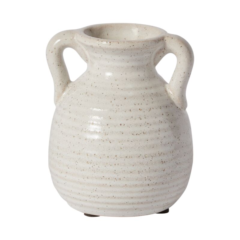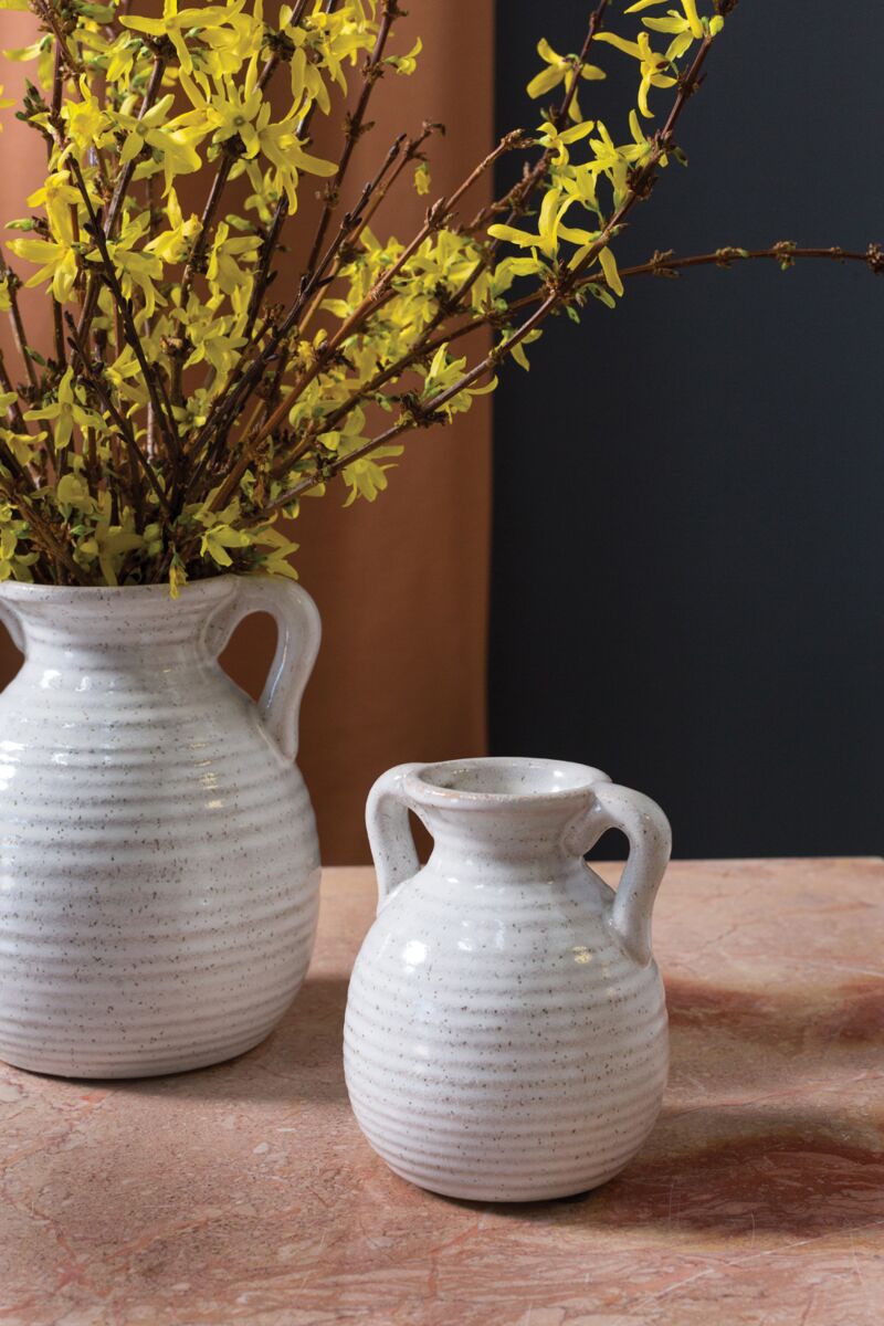 The Trevi Vase is a classically shaped ceramic vase finished with an off white glaze. Its curved handles and ribbing around the body make it perfect in form and function.
