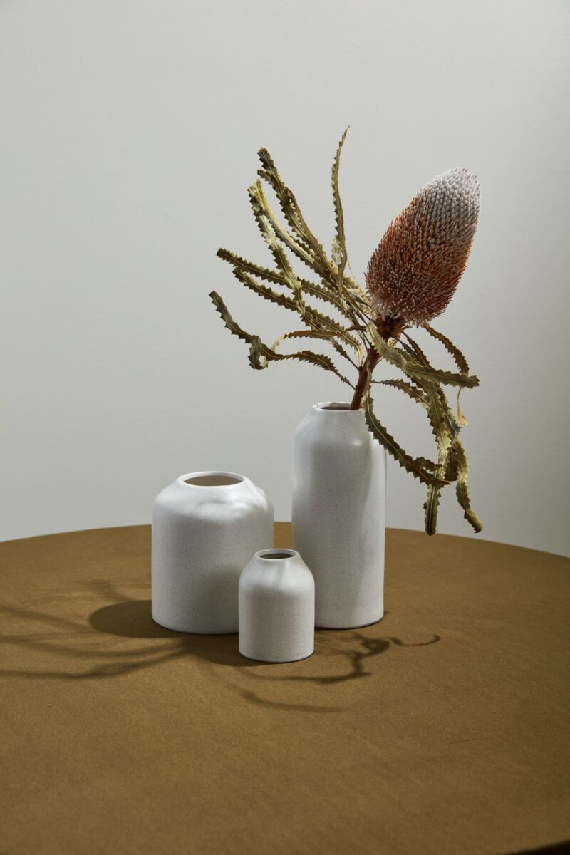 The Flynn Vase is a cylindrical ceramic piece with a narrowing at the mouth and speckled glazed finish for a modern neutral look.