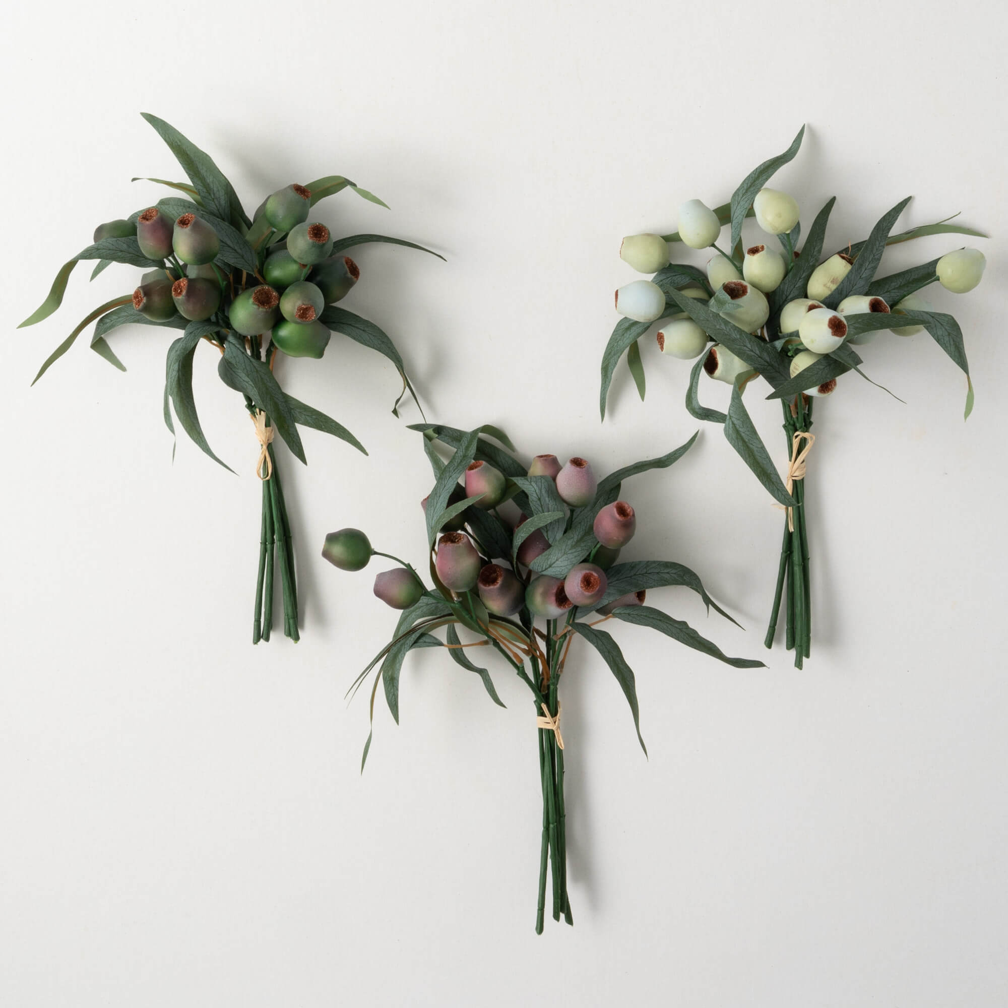 These unique berry bushes feature long blade eucalyptus and pods in a variety of versatile colors. In subtle colors of green, deep red, and cream, this trio of bushes is a perfect accent for a shelf, mantel or as an addition to an existing arrangement.