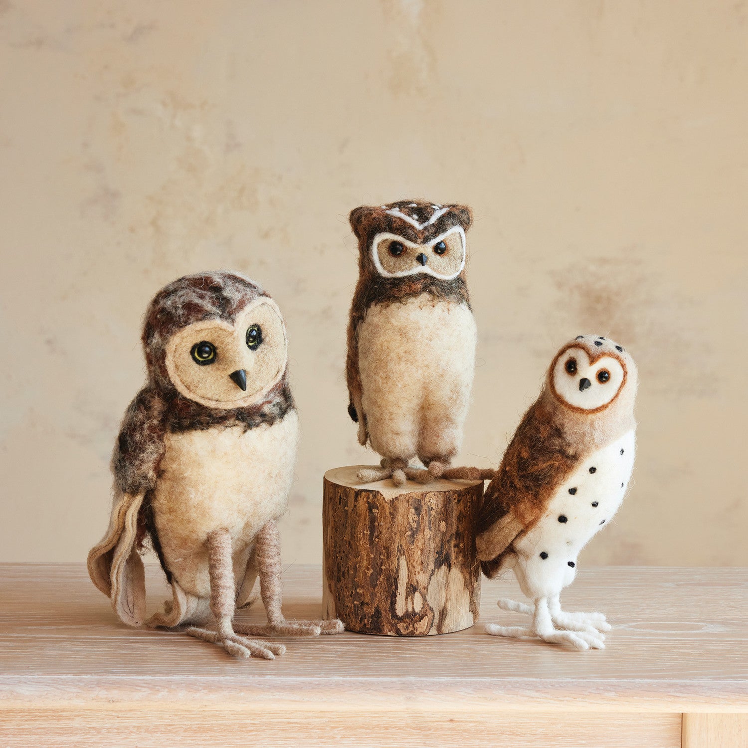 The Handmade Wool Felt Barn Owl measures 4 inches long, 4-1/4 inches wide, and 9-1/2 inches high, showcasing meticulous craftsmanship in every detail. Made from high-quality wool felt, this brown barn owl captures the essence of the species with a soft texture and lifelike form. Its handcrafted construction ensures each piece is unique, making it a refined decorative accent for nature-inspired interiors or seasonal displays. This owl adds a touch of rustic elegance and expert artistry, perfect for collectors or those seeking a sophisticated woodland motif in their décor.